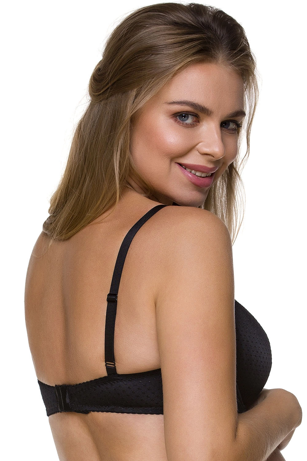 Das Modell besitzt dreistufigen Rückenverschluss und zweireihige Umfangsregulierung, regulierbare und nicht abnehmbare Träger. Das Modell ohne vertikale Seitenstäbchen. Zwischen der Cups ein kokettes Schleifchen.