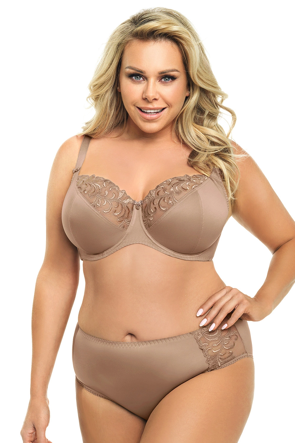 Die Essenz der Weiblichkeit! Der Soft BH aus der Reihe BIG in toller Farbzusammenstellung, ideal für größere Größen. Der obere Teil des Cups gefertigt aus wunderschöner Stickerei, verstärkt mit zartem Netzstoff. Der untere Teil des Körbchens und die Brücke gefertigt aus festem Gewebe. Zugfester Gewebestoff sammelt gut die Brüste hinein. Seitenteile wurden aus zugfestem Lycrastoff gefertigt. Das Modell besitzt Seitenstäbchen für noch besseren Halt der Brüste. Die Träger sind regulierbar, nicht abnehmbar. In dem Modell wurden zweireihige Ösen mit zwei- oder dreistufiger Regulierung benutzt, abhängig von der BH-Größe. Zum Unterwäsche-Set empfehlen wir Ihnen auch Gorsenia K379 Victoria, der auf separater Produktseite zu kaufen ist.