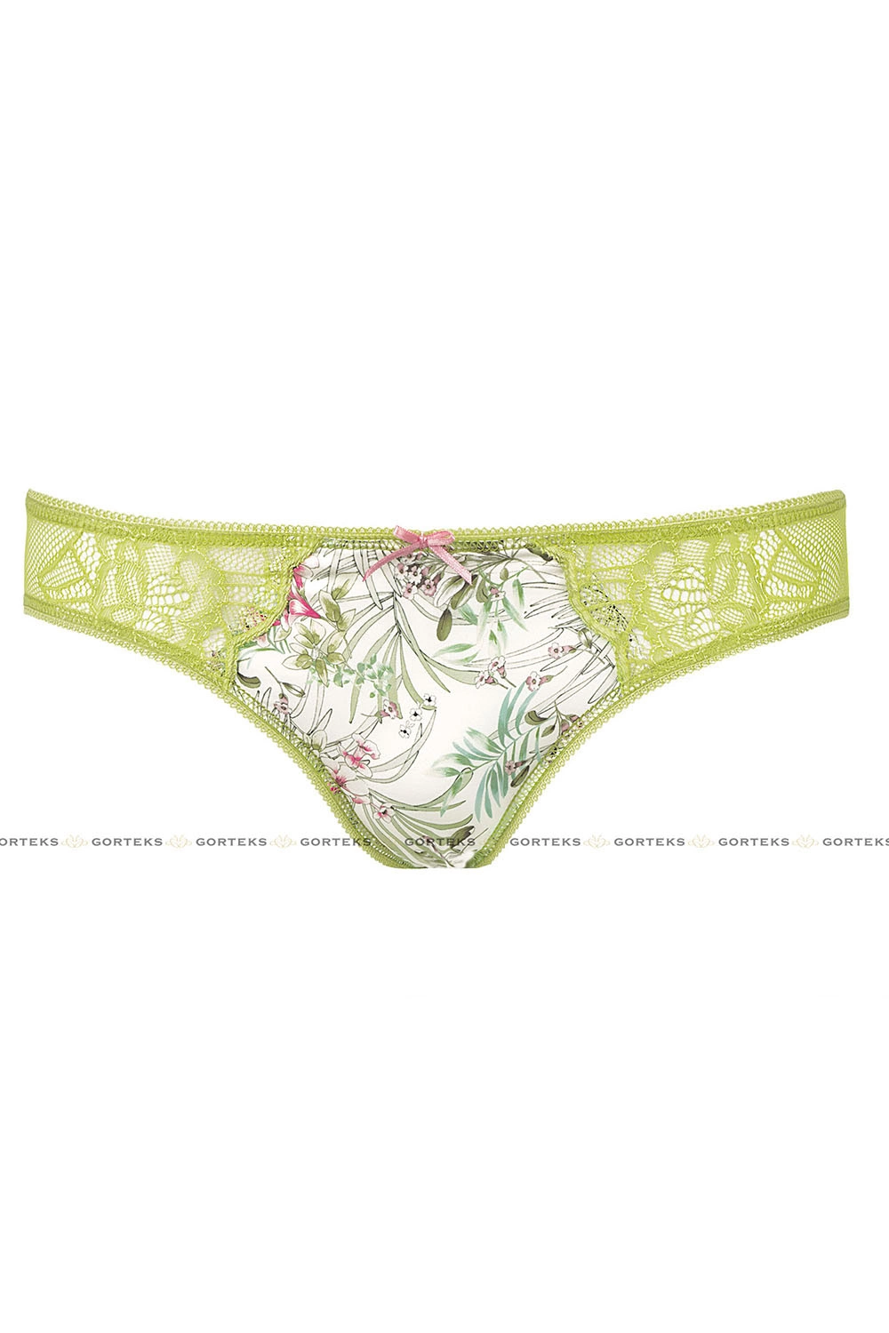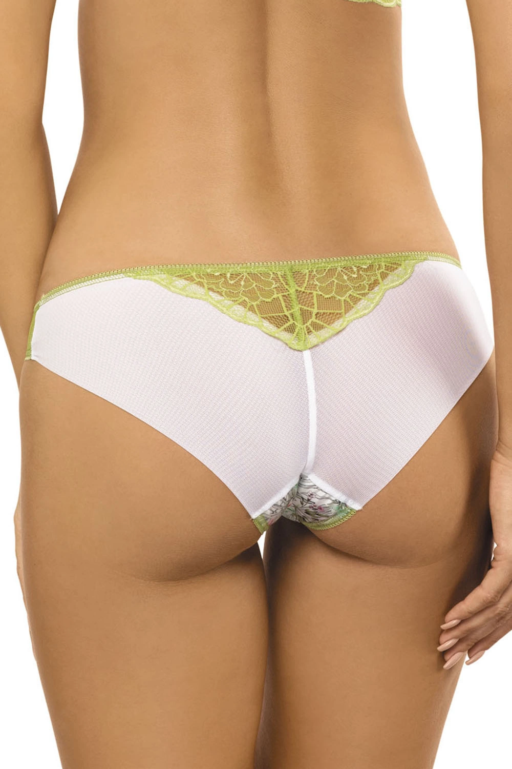 Weiblicher Slip gefertigt aus einem weichen und gemusterten Gewebe, geschmückt mit subtiler Blumenspitze in wunderschöner Farbe.