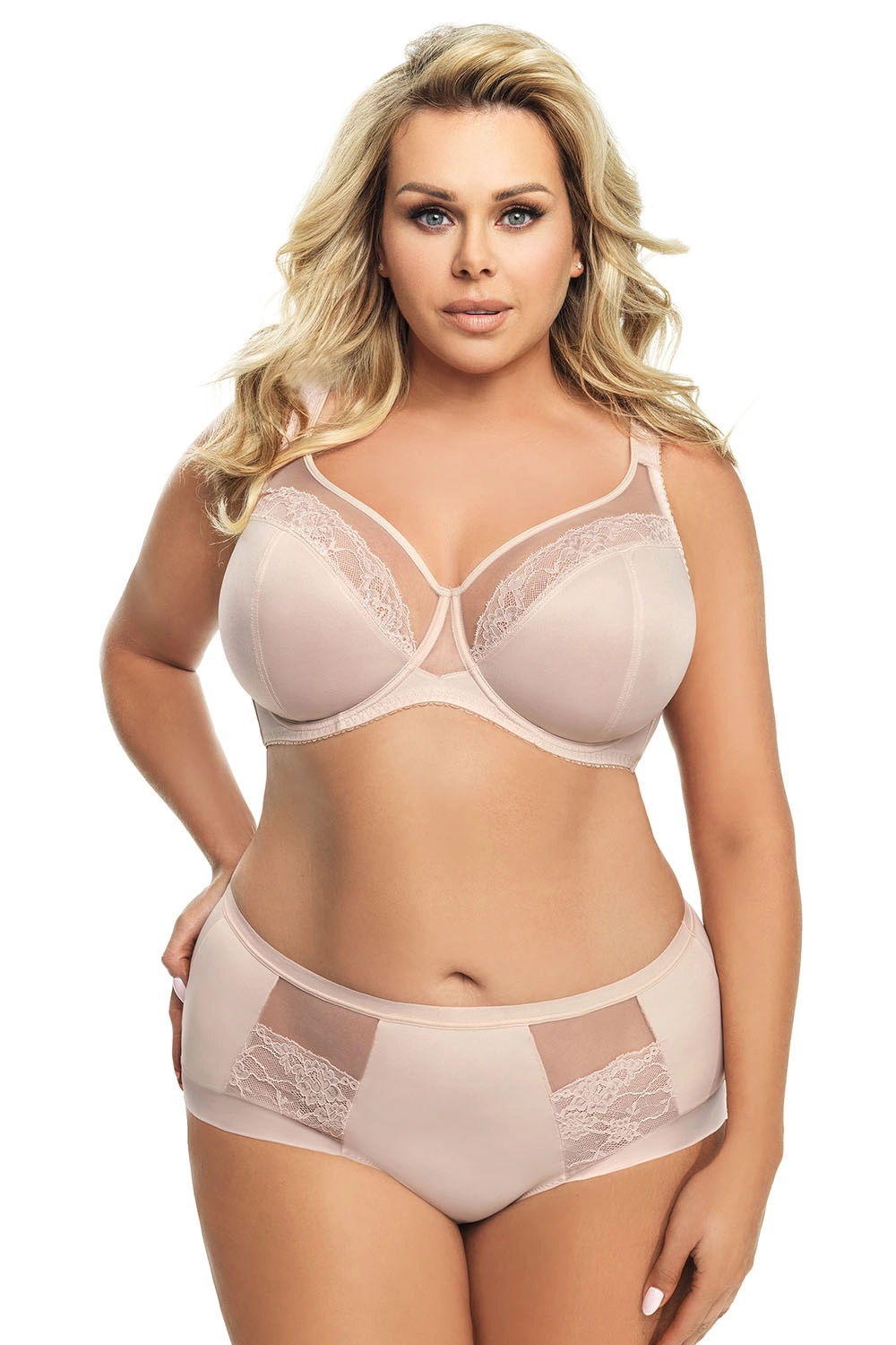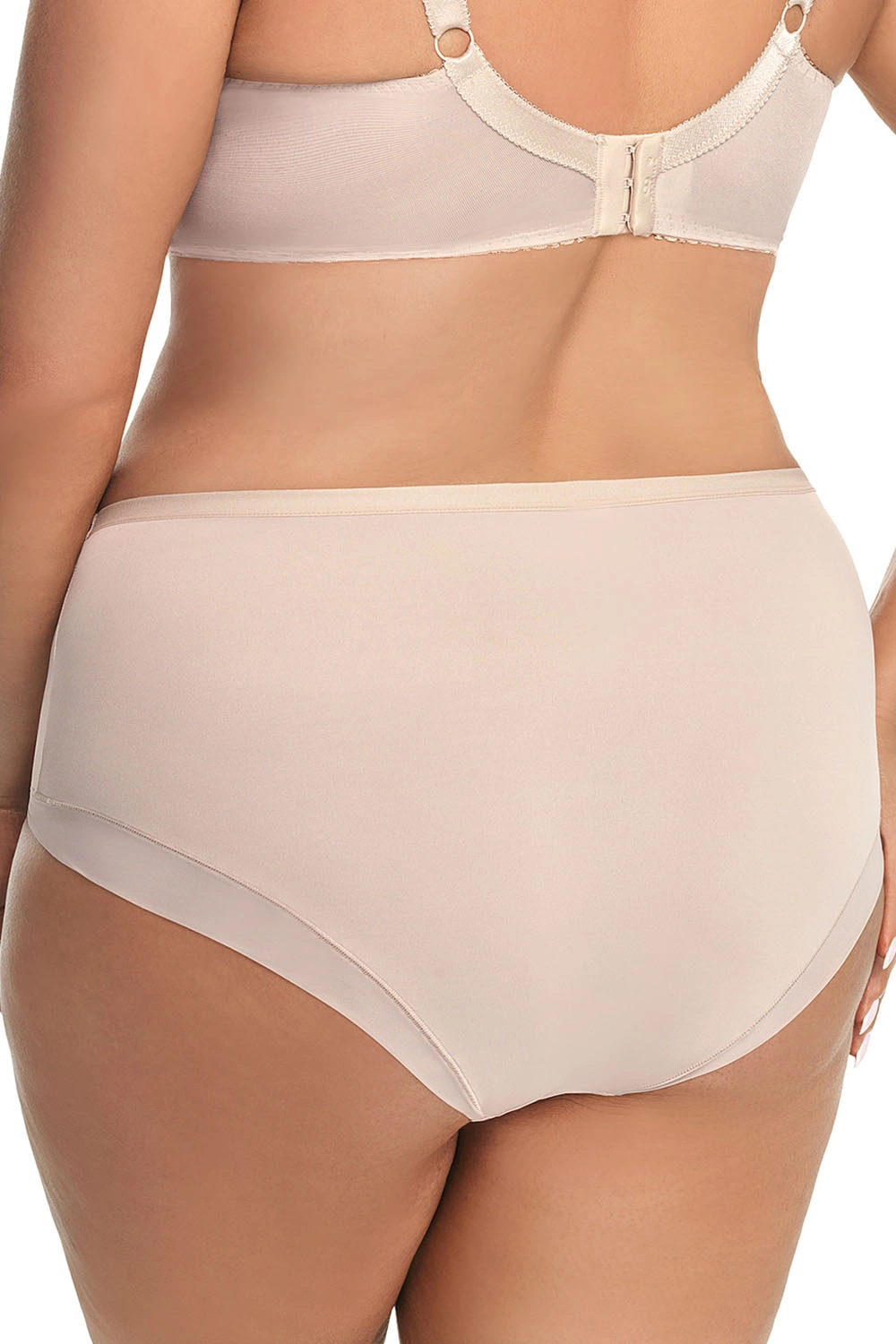 Eleganter Slip in beiger Farbe. Gefertigt aus einem weichen Microfaserstoff, vorne geschmückt mit zwei Einsätzen von Spitze. Hinterteil glatt. Beinabschlüsse beendet mit doppeltem elastischem Tüllmaterial.
