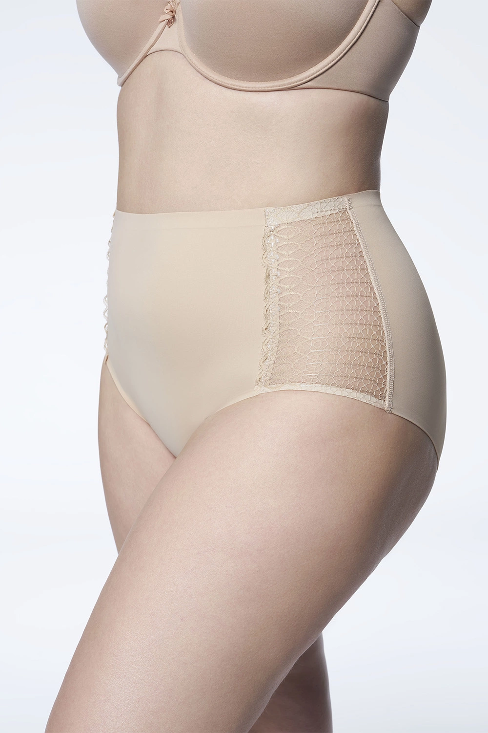 Klassischer Slips mit leicht erhöhter Taille aus glattem, flexiblem Material. Unsichtbar unter der Kleidung dank nahtloser, moderner Kantenveredelungstechnologie - INVISIBLE-LINE-Technologie. Die Vorderseite ist mit Einsätzen aus verführerischer, durchbrochener Spitze verziert.
