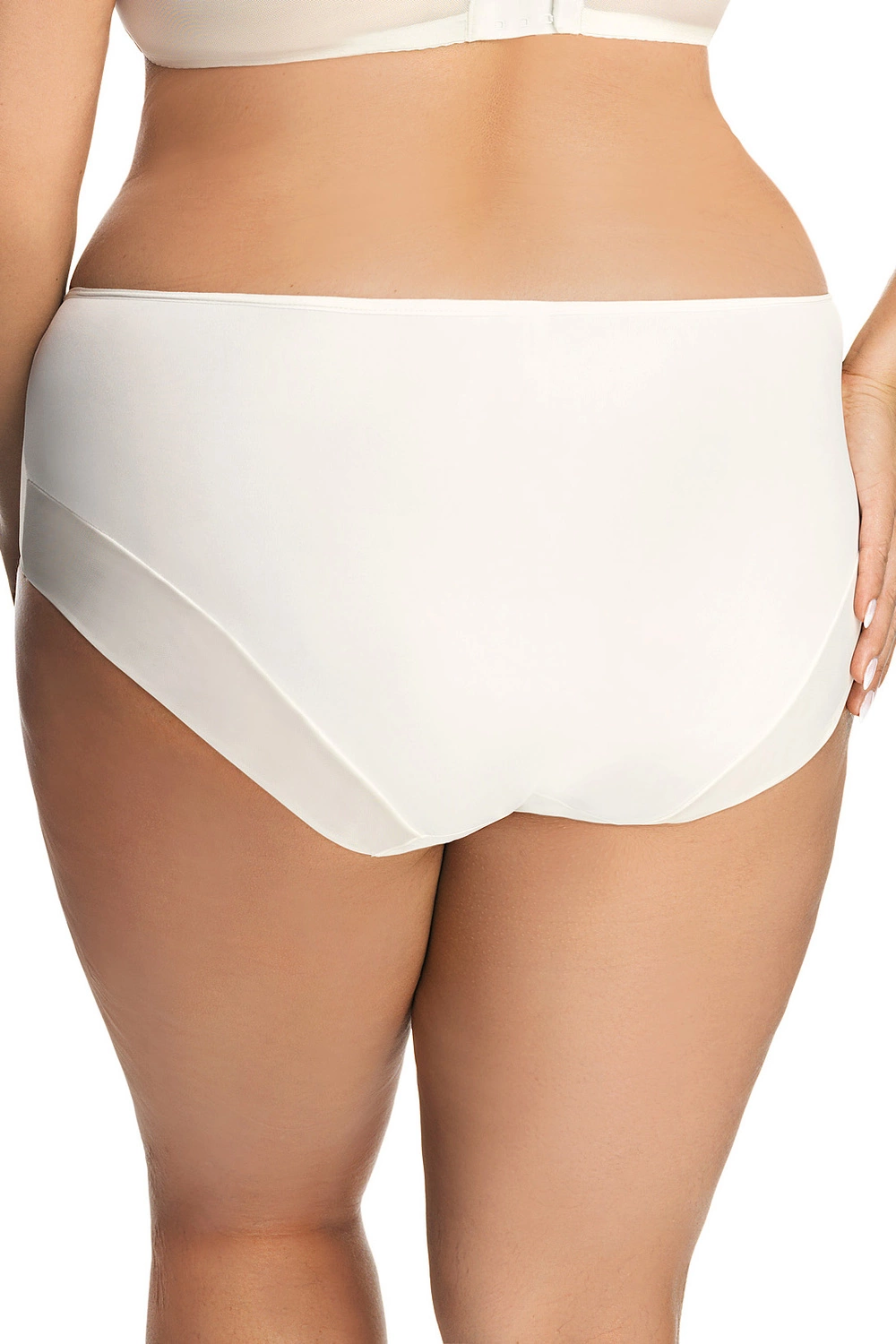 Slip mit hohem Bund gefertigt aus einer weichen Mikrofaser verziert vorne mit zwei Einsätzen aus einem beigen Tüll und zarter Spitze. Hinterteil glatt. Beinabschlüsse vorne ausgearbeitet mit glattem elastischen Band. Beinabschlüsse hinten ausgearbeitet mit doppeltem glattem und elastischem Tüll.