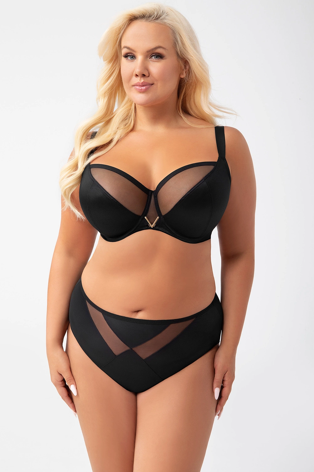 Eleganter und sehr bequemer schwarzer, weicher BH. Entworfen für Frauen mit mittelgroßen und großen Brüsten. An den unteren Teilen der Schalen wurde ein stabiler Simplex verwendet, der die Bildung der Brust und die Stabilisierung während des Gebrauchs garantiert.
