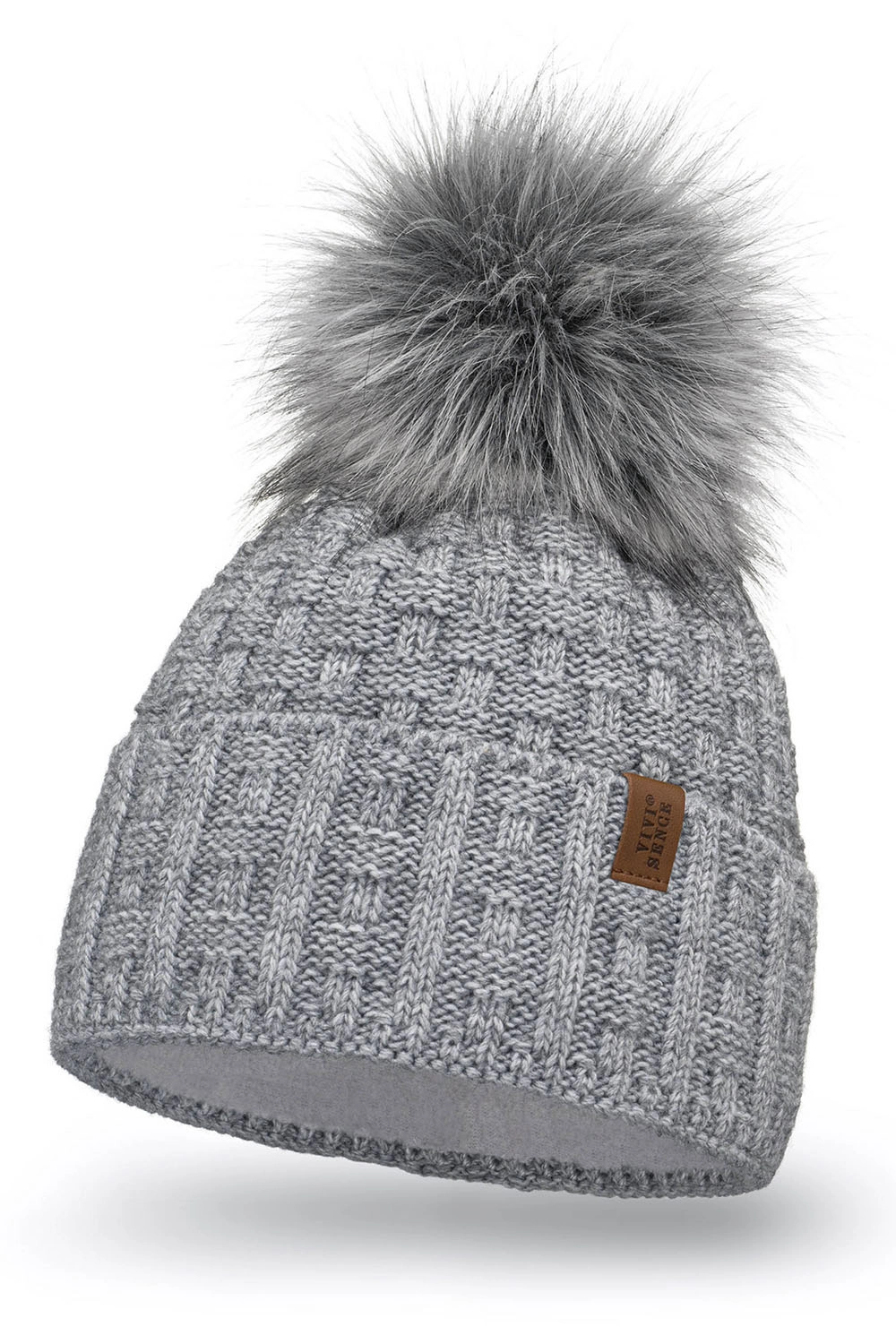 Vivisence Damen Mütze Bommel Warm Fleece Gefüttert Strick Winterstyle 7015, hellgrau