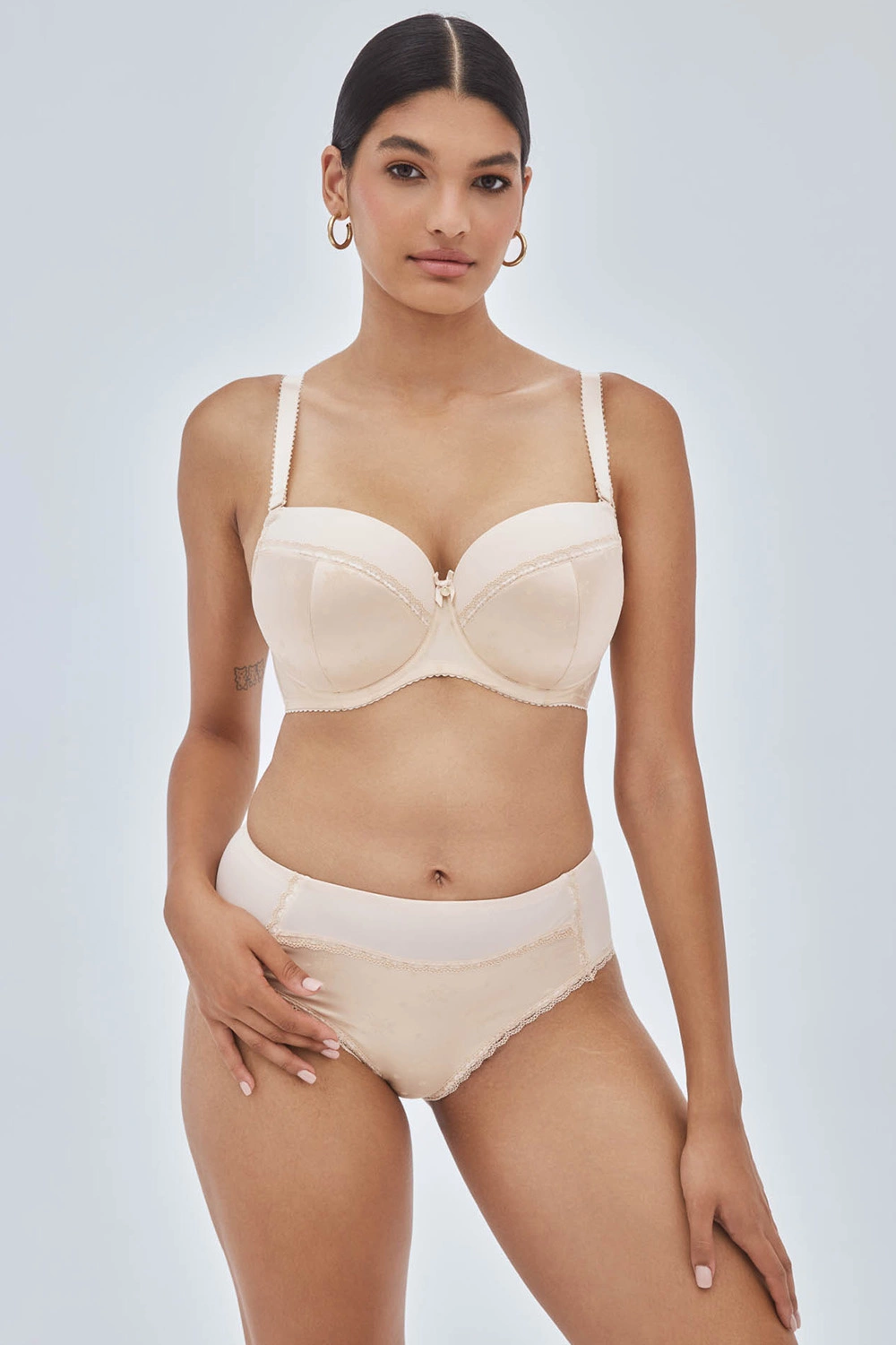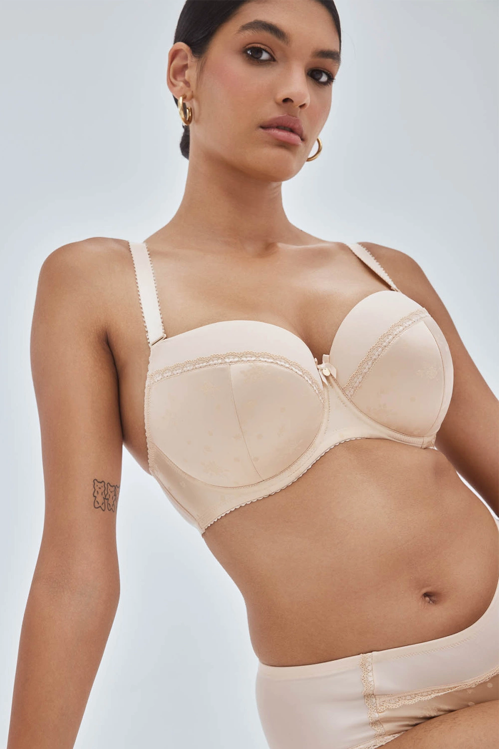 Das Design formt die Brust perfekt und sorgt für die richtige Anordnung in den Cups. Der obere Teil der Tasse besteht aus einem glatten Gewebestoff. Der untere Teil der Schale und der Steg sind mit Jacquard-Satin bedeckt. Seiten aus elastischem Stoff, zusätzlich mit einer Seitenlinie und einem seitlichen Bügel verstärkt, um die Stabilität des Umfangs zu gewährleisten.
