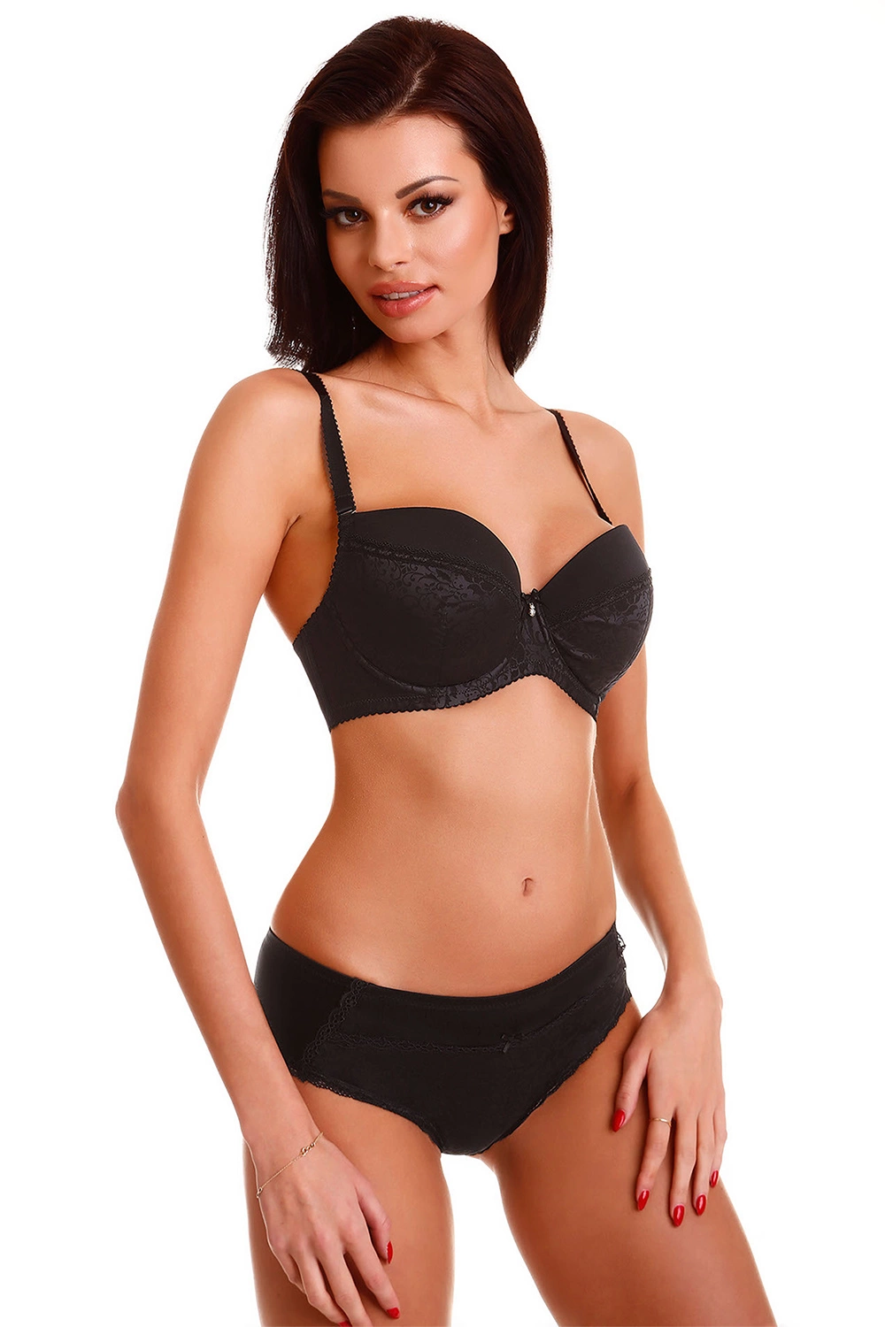 Das Design formt die Brust perfekt und sorgt für die richtige Anordnung in den Cups. Der obere Teil der Tasse besteht aus einem glatten Gewebestoff. Der untere Teil der Schale und der Steg sind mit Jacquard-Satin bedeckt. Seiten aus elastischem Stoff, zusätzlich mit einer Seitenlinie und einem seitlichen Bügel verstärkt, um die Stabilität des Umfangs zu gewährleisten.