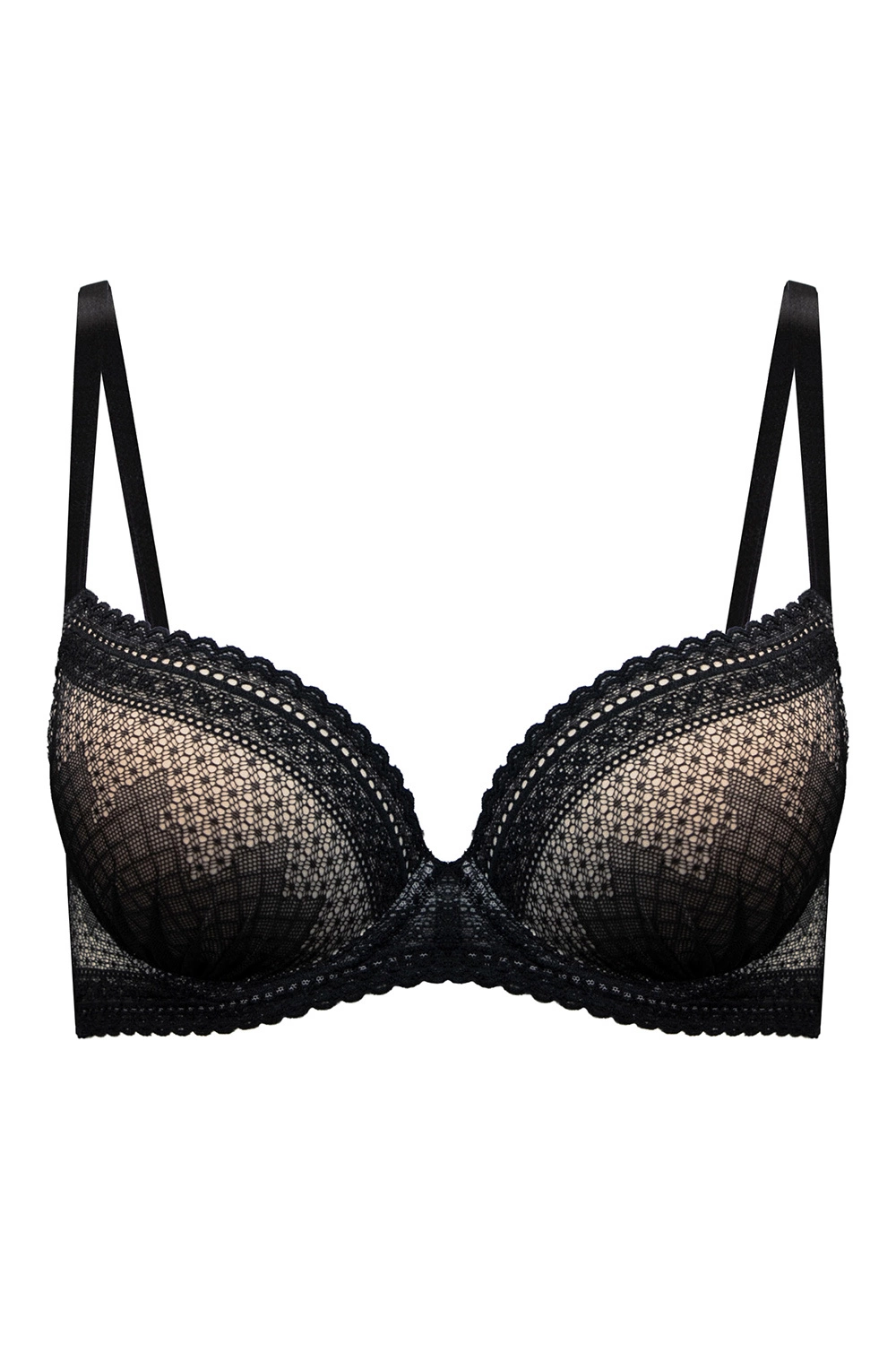 Ein eleganter BH in klassischen Farben aus glattem Mikrofaserstoff hergestellt. Modell mit thermisch geformten Cups.