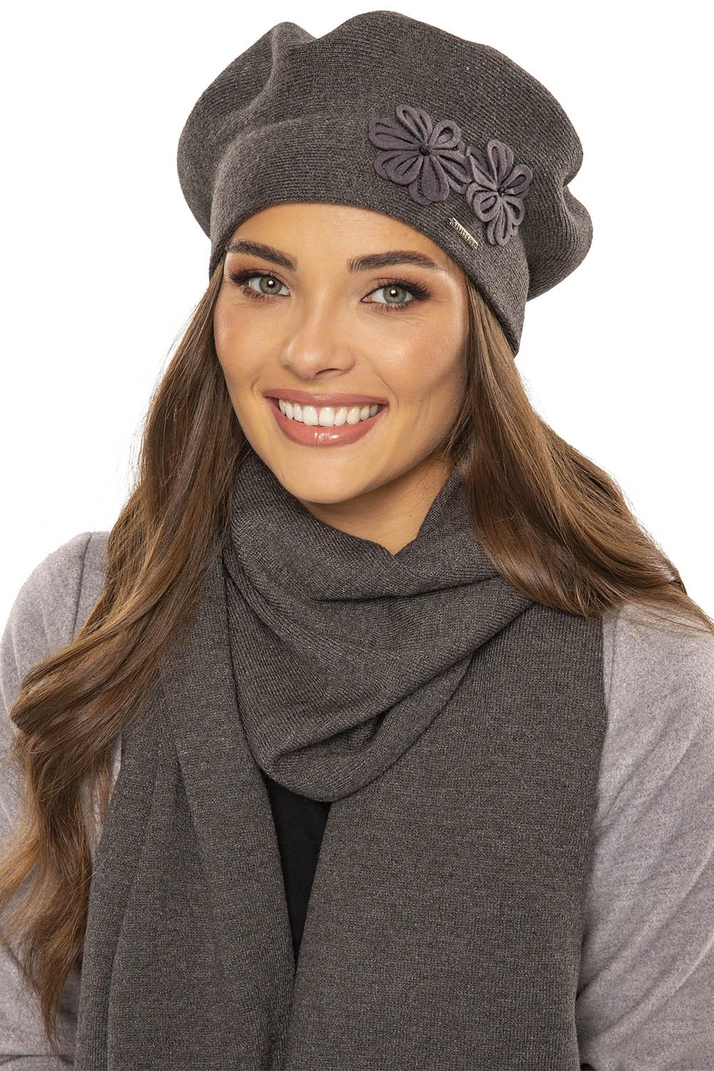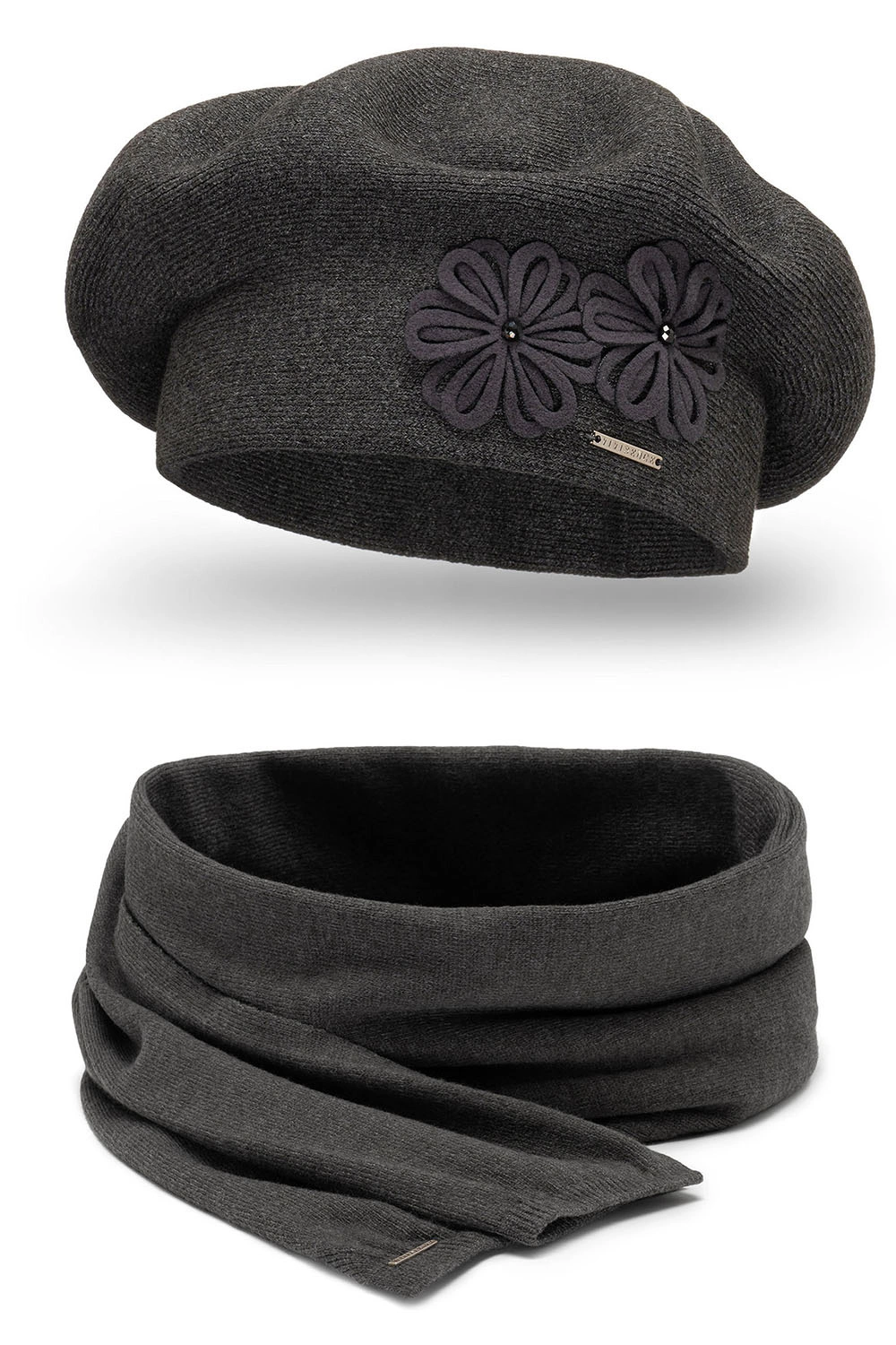 Vivisence Damen Baskenmütze Schal Set Wolle Blumenapplikation Warm Elegant 7007, dunkelgrau