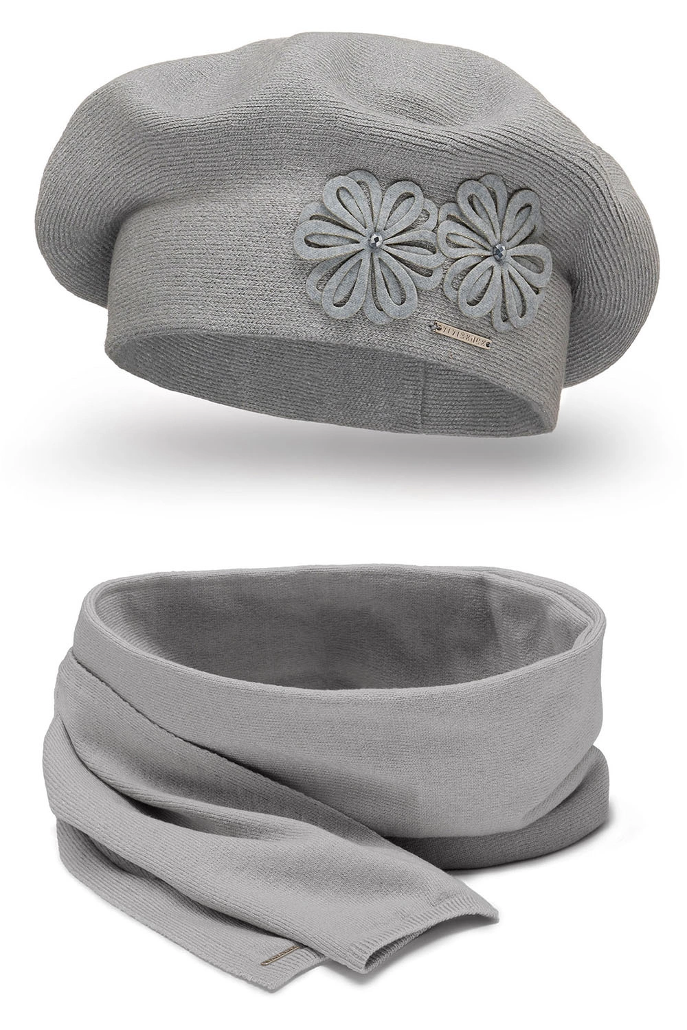 Vivisence Damen Baskenmütze Schal Set Wolle Blumenapplikation Warm Elegant 7007, hellgrau