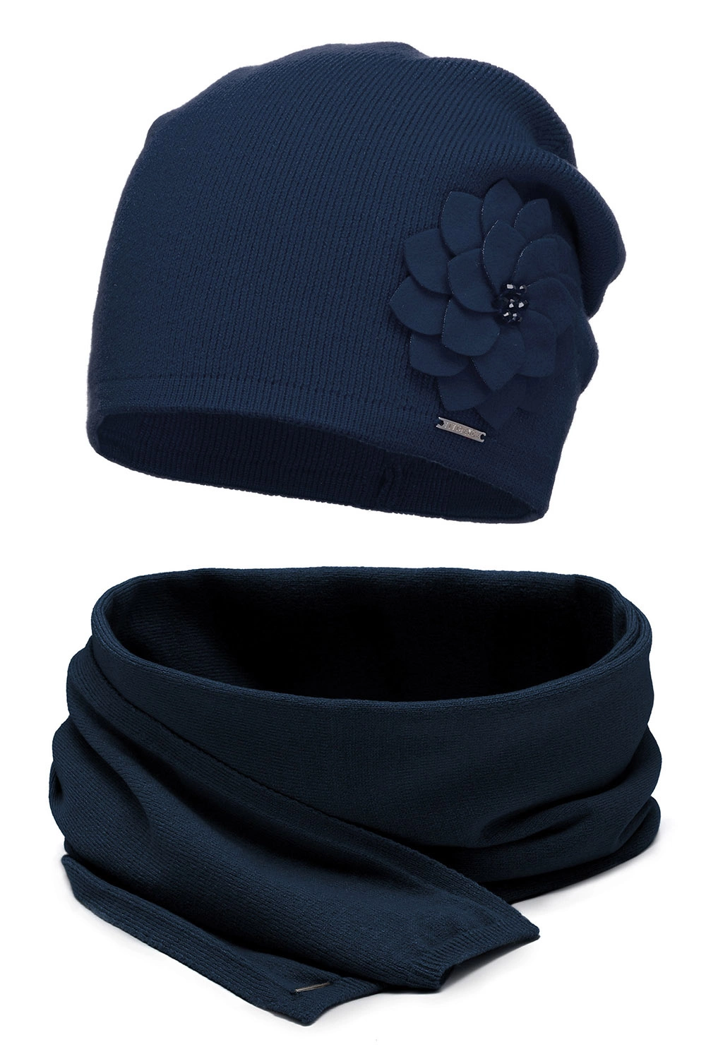 Vivisence Trendiger Damen Winter Set Aus Wintermütze Und Schal Mit Wärmendem Garn Antistatische Blumenapplikation Und Falten Design Perfekt Für Kalte Wintertage, dunkelblau