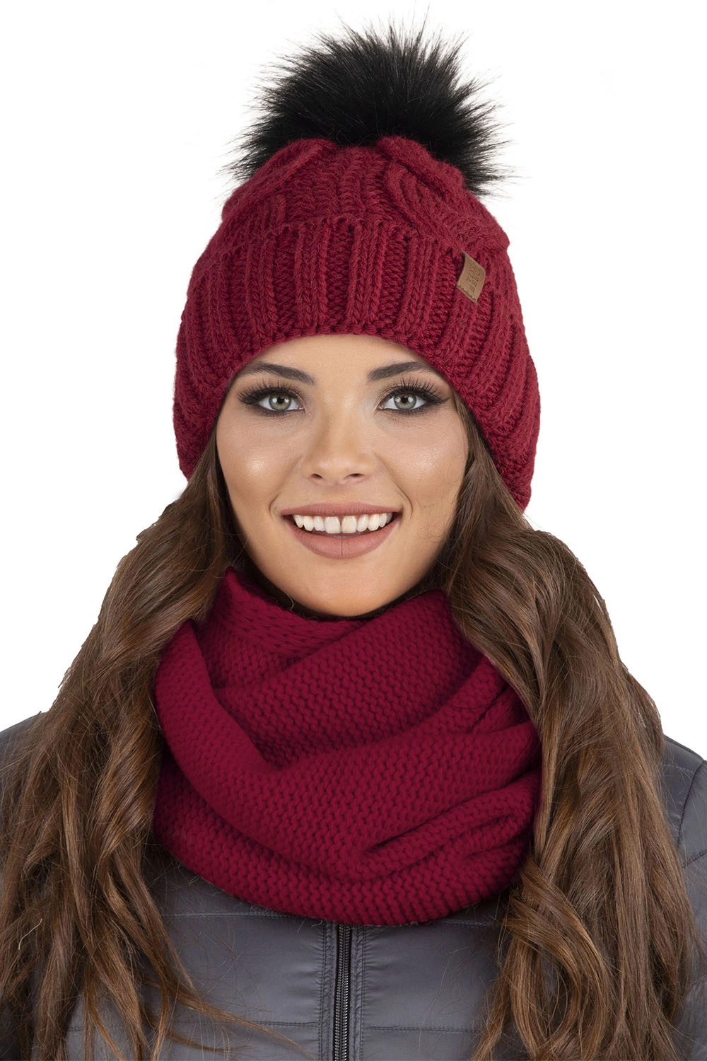 Trendiger Set: Bommelmütze und Loop-Schal.