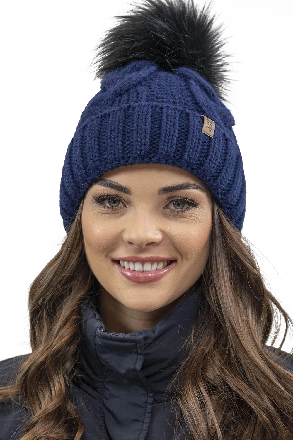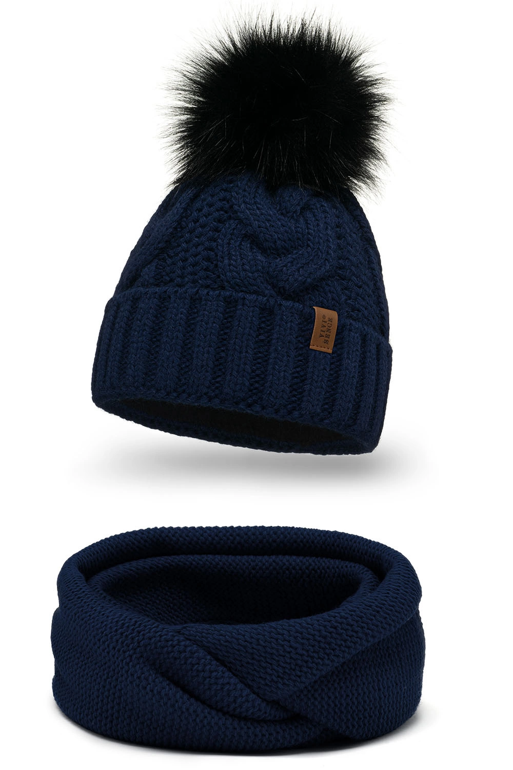 Vivisence Damen Bommelmütze Und Loop-Schal Mit Bommel Ideal Für Wintertage 7014, dunkelblau