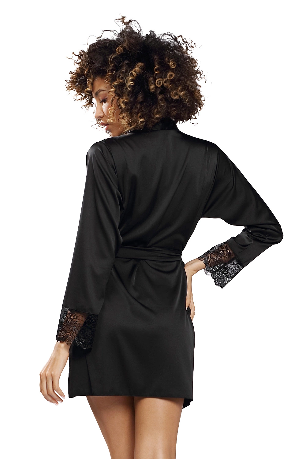Dkaren Dame Morgenmantel Peignoir langarm musterlos kurz Spitze Marlena, Schwarz