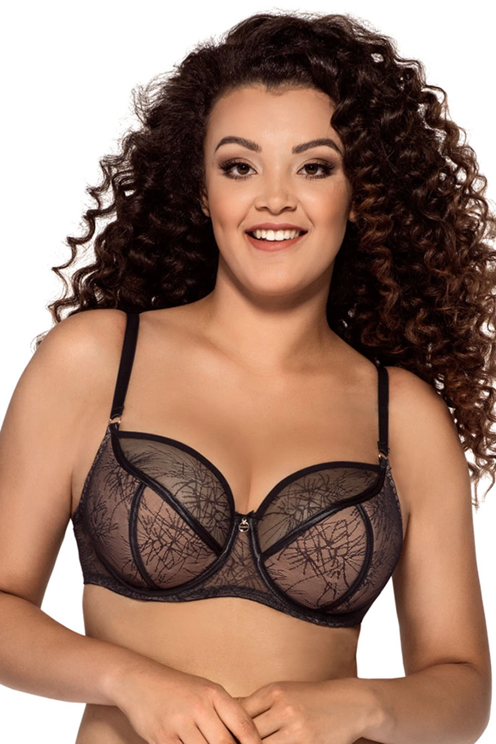 • versteifte Cups aus gemustertem Netzstoff und beiger Strickwaren
