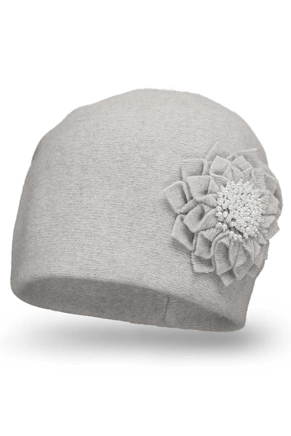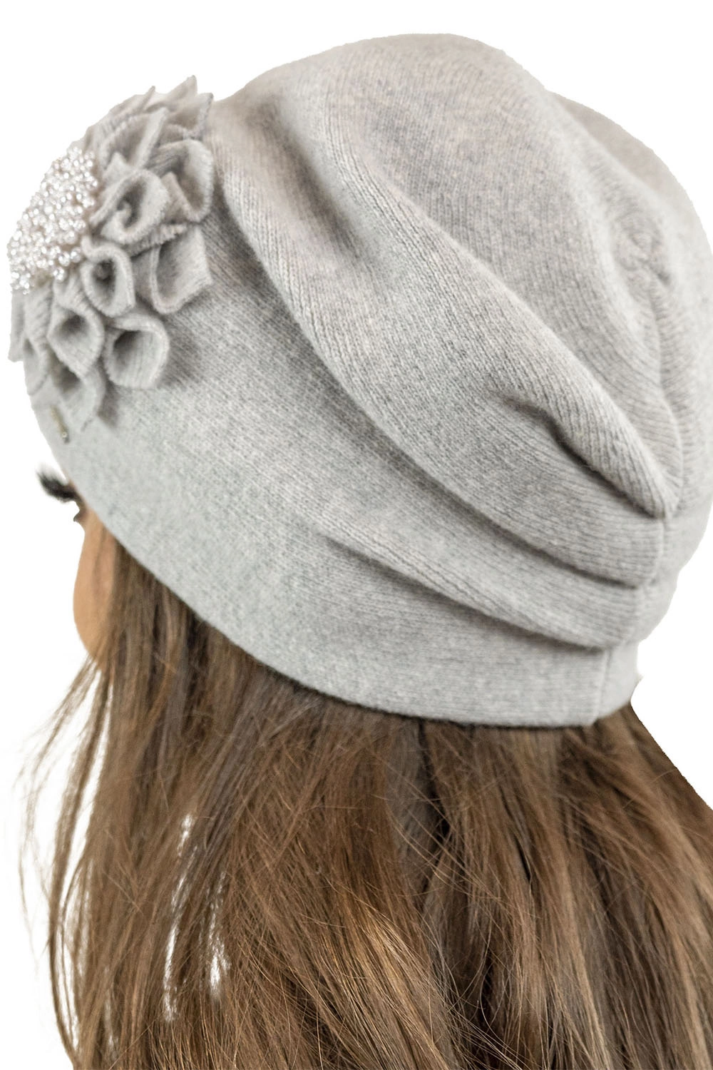 Vivisence Damen Mütze Wolle Blumenapplikation Falten Antistatisch Elegant 7052, hellgrau