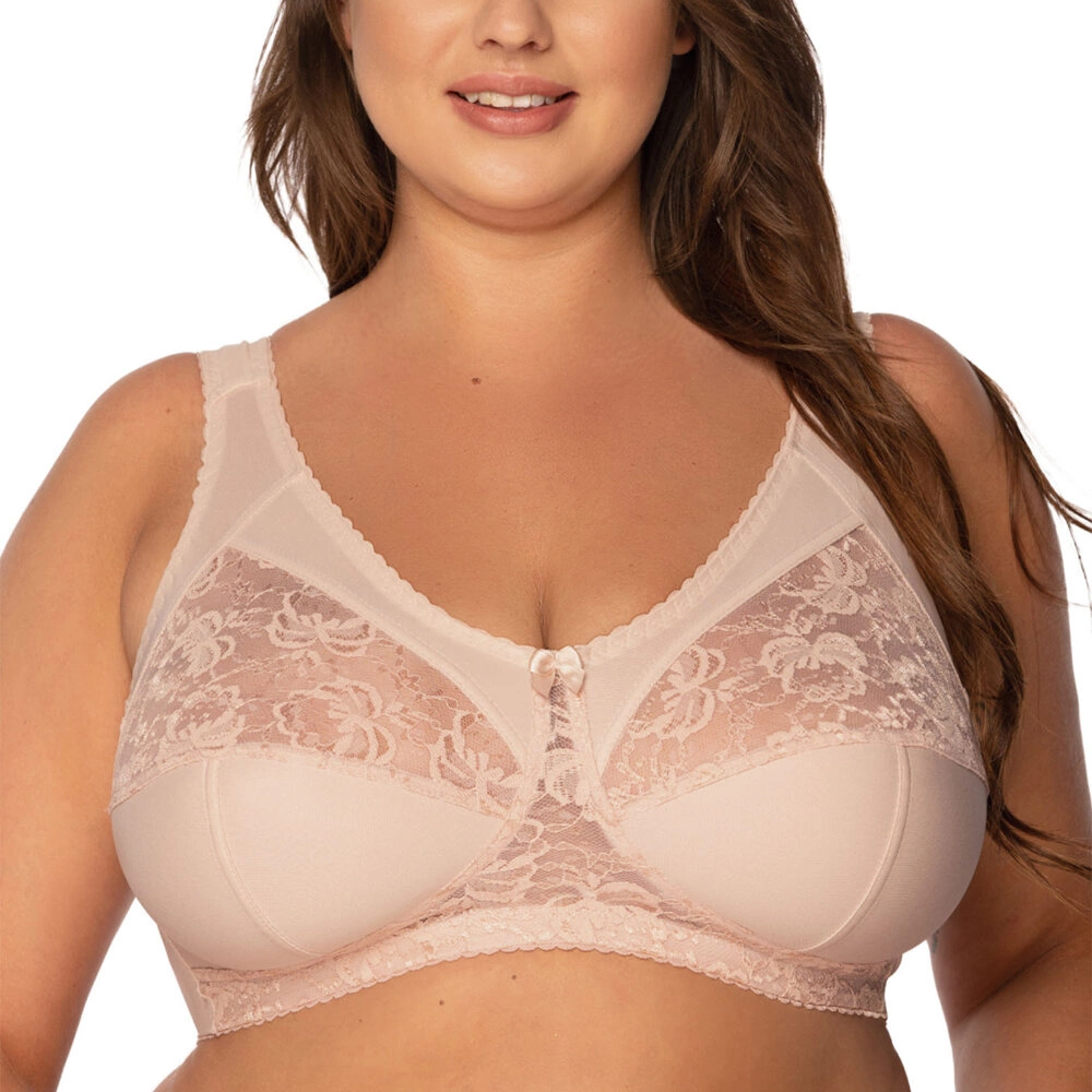 Soft-BH für Damen. Die stark aufgebaute Struktur mit hoher Mitte verleiht den Brüsten eine schöne, natürliche Form. Der obere Teil des Körbchens ist aus elastischer Spitze hergestellt. Das Modell richtet sich vor allem an Frauen, einer natürlich ausdauernden Oberweite haben möchten.