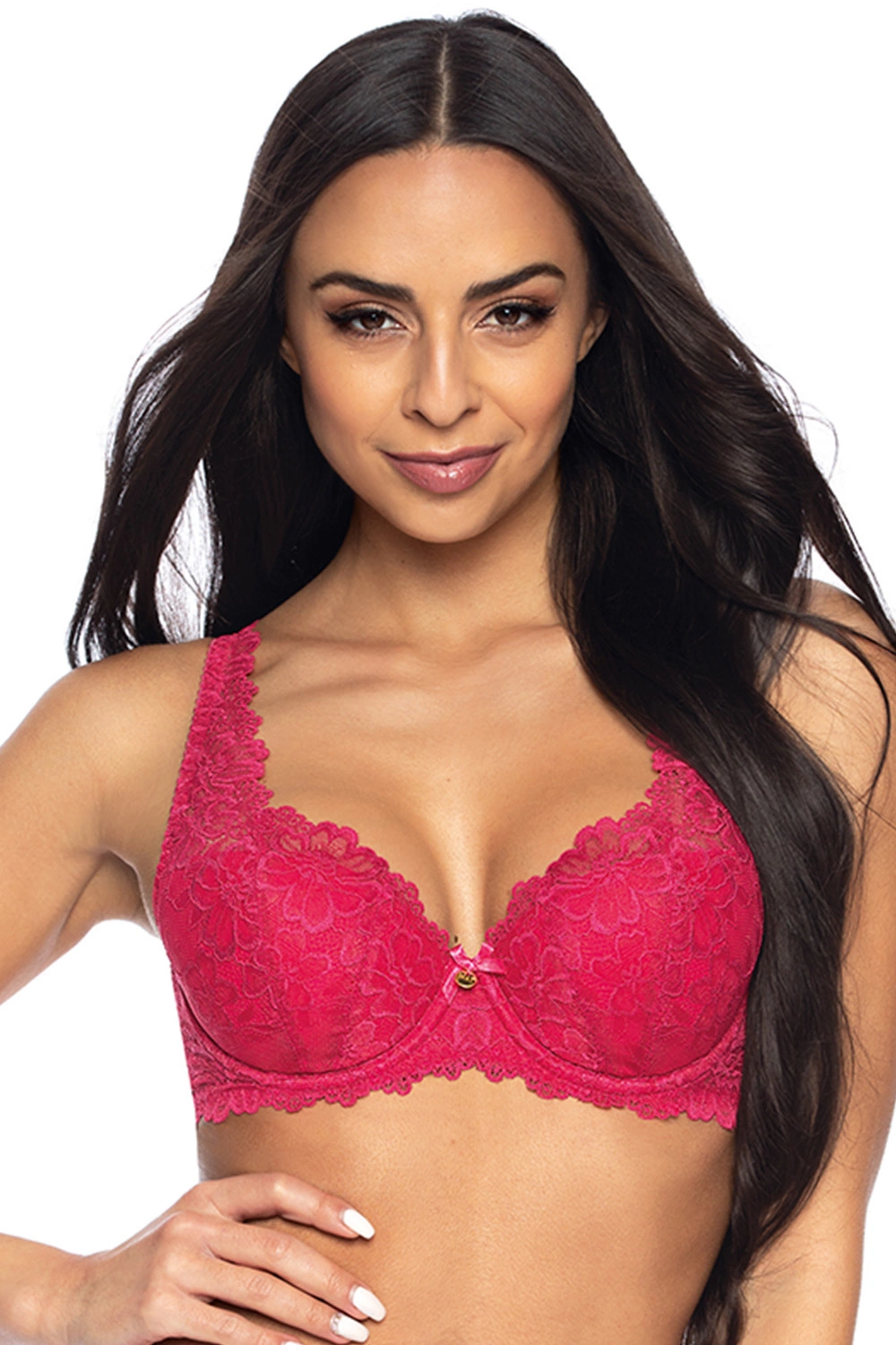 Weiblicher BH mit versteiften Schalen.- Cups und Steg aus zarter Spitze mit Blumenmuster- in der Mitte mit einem kleinen Schleifchen verziert- regulierbare, nicht abnehmbare Träger mit Spitzenverzierung- die Bügel formen und unterstützen die Brüste- Hinterteil aus subtilem Netzstoff (Farben: weiß, schwarz)- Hinterteil aus Spitze (andere Farben)- mit vertikalen Seitenstäbchen (Farben: weiß, schwarz, rot)- ohne vertikale Seitenstäbchen (andere Farben)Zum Set empfehlen wir Slip und Shorts Carmela.Materialzusammensetzung:Weiß, schwarz, rot:66% Polyamid, 18% Baumwolle, 10% Polyurethan, 6% Elasthan.Andere Farben:44% Polyamid, 17% Baumwolle, 17% Polyesther, 17% Polyurethan, 5% Elasthan.