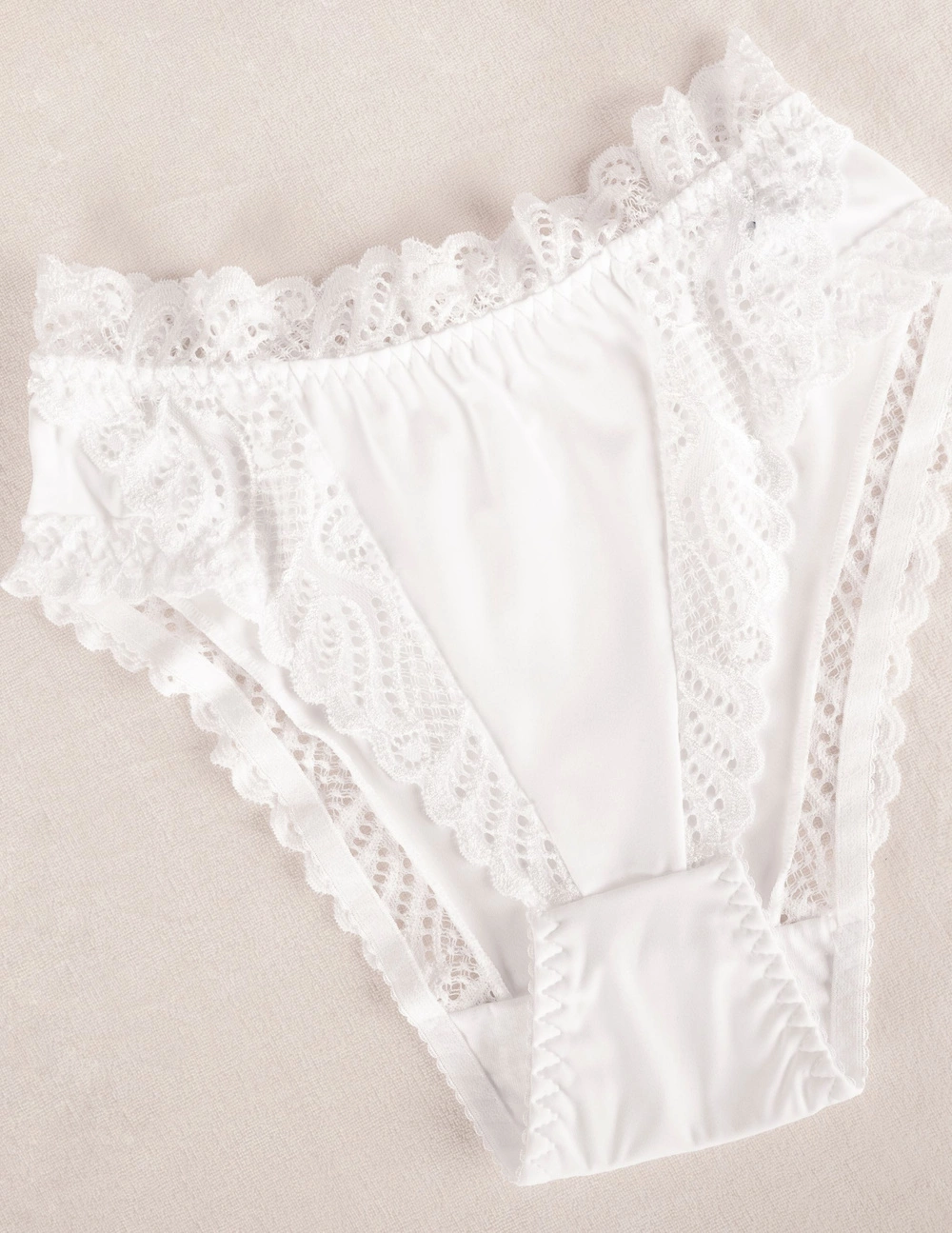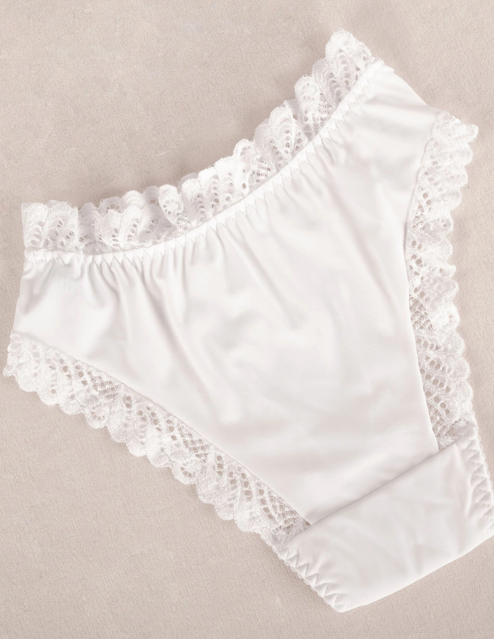 - Vorderseite mit diagonalen Nähten die schmälernd wirken; Bund und Beinenden mit elastischer Spitze verziert