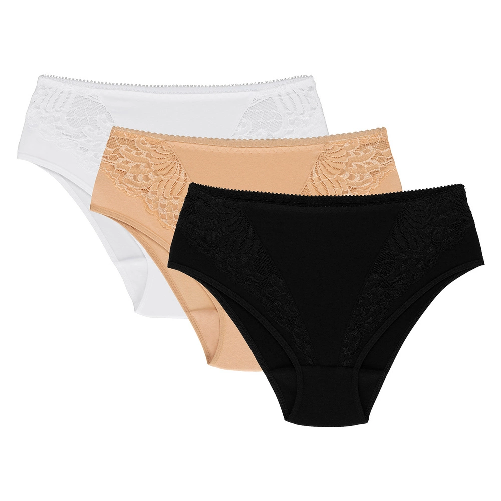 Wolbar Damen Maxi-Slip Mit Spitzeneinsatz 3-er Pack Komfortabel Elegant Unterwäsche WB51, beige-weiß-schwarz