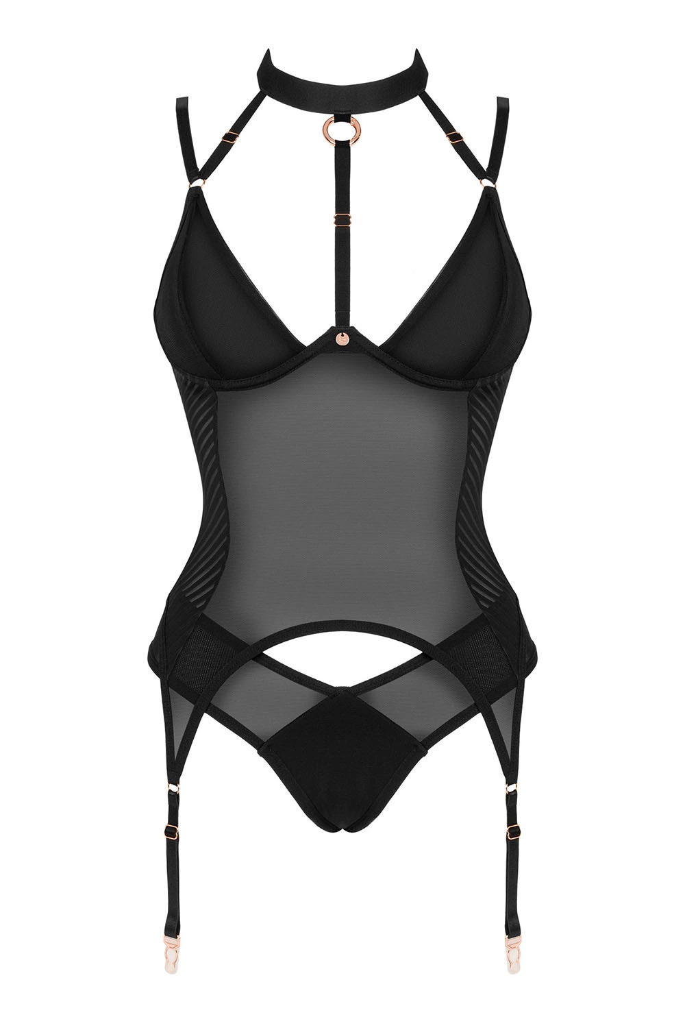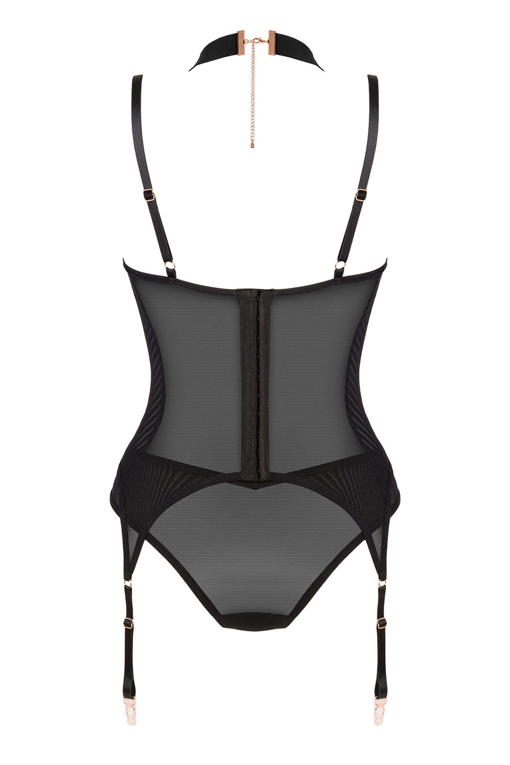 Schwarzes Korsett ist ein eleganter, geschmackvoller Vorschlag aus feinem Netzstoff und gestreiftem Material. Wunderschöne Metallverzierungen in Roségold in modernem Stil. Ideal für viele heiße Anlässe!