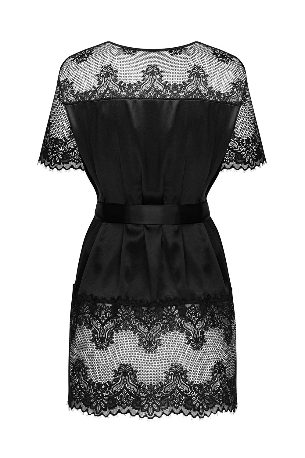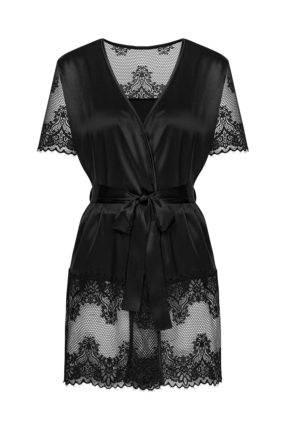 Obsessive Dame Morgenmantel Satin Spitze Sexy Durchsichtig Sinnlich Gemustert Dessous Maderris, Schwarz