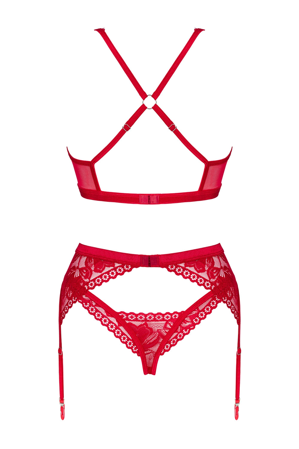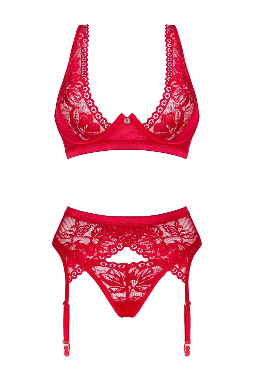Obsessive Dame Reizwäsche 3-teiliges Set Sexy Dessous Spitze String Strumpfgürtel Strapsen Lacelove, Rot