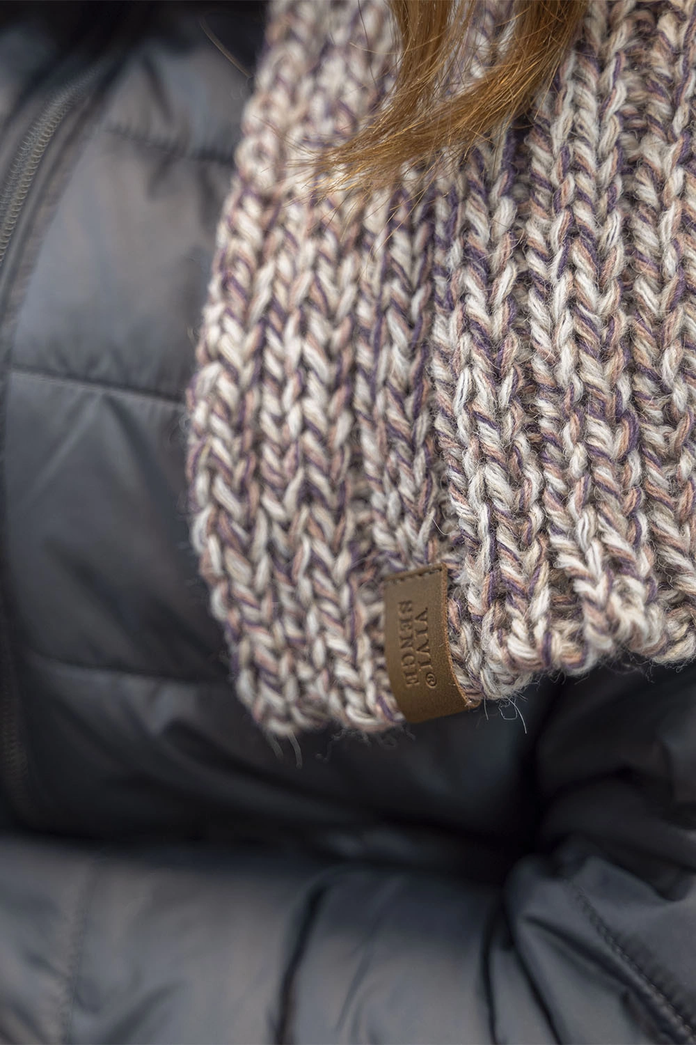 • ist aus warmem, zweifarbigem Garn gefertigt.