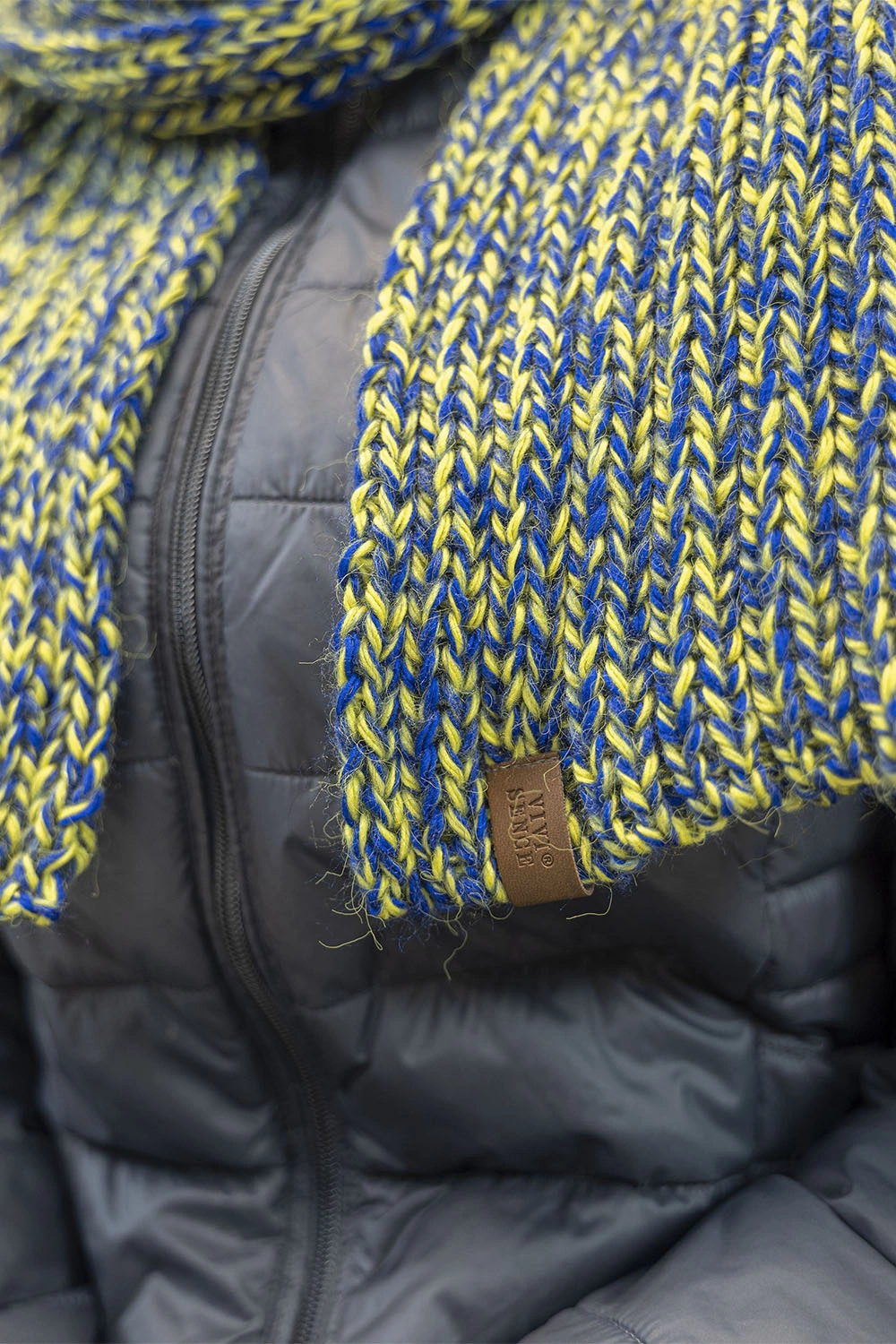 - ist aus warmem, zweifarbigem Garn gefertigt.