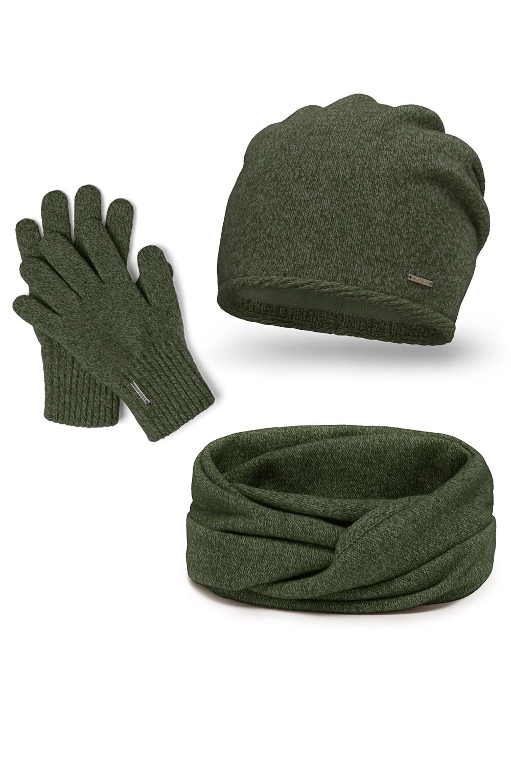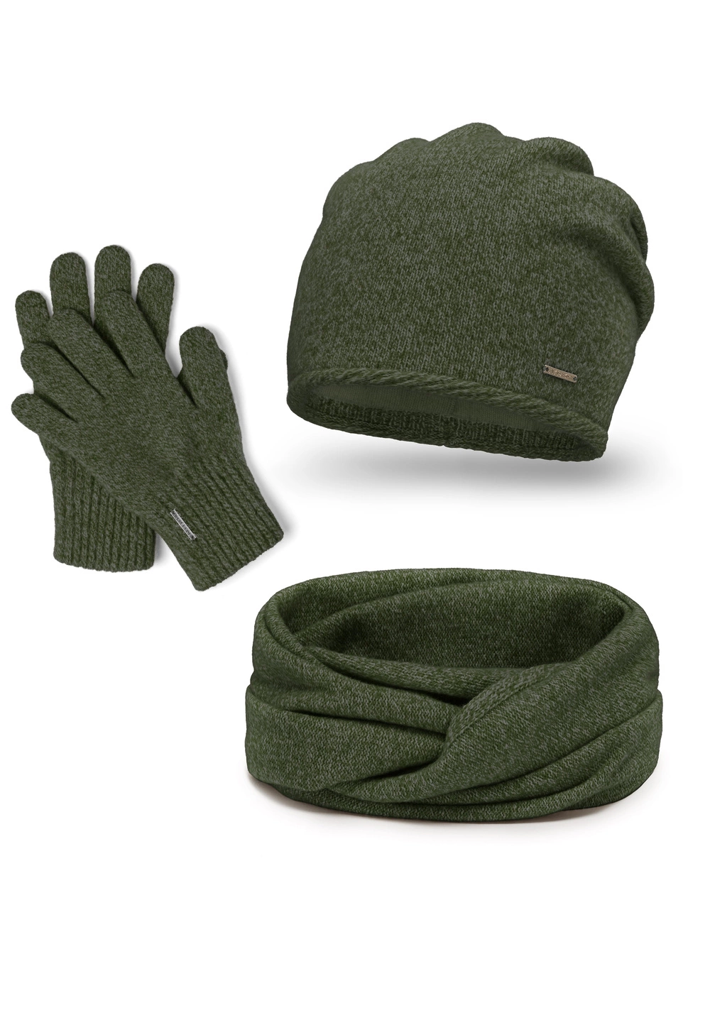 Vivisence Winter Damen Set Aus Wolle Mit Mütze, Schal Und Handschuhen Hergestellt Aus Weich Und Warm Garn Mit Melange-Muster Ideal Für Kalte Wintertage, grüne Melange