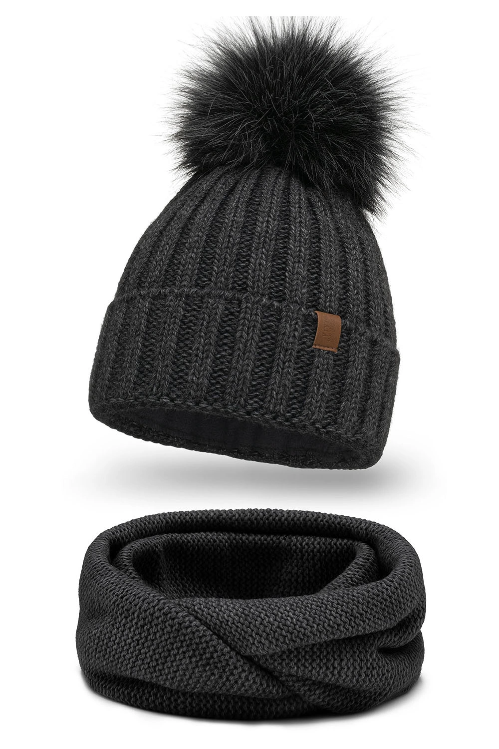 Vivisence Trendiges Damen-Set Mütze Mit Kunstpelz-Bommel Und Loop-Schal Aus Warmem Garn Antistatisches Fleece-Innenfutte, Perfekte Passform Mit Logo Aus Öko-Leder Ideal Für Kalte Wintertage, schwarzgrau