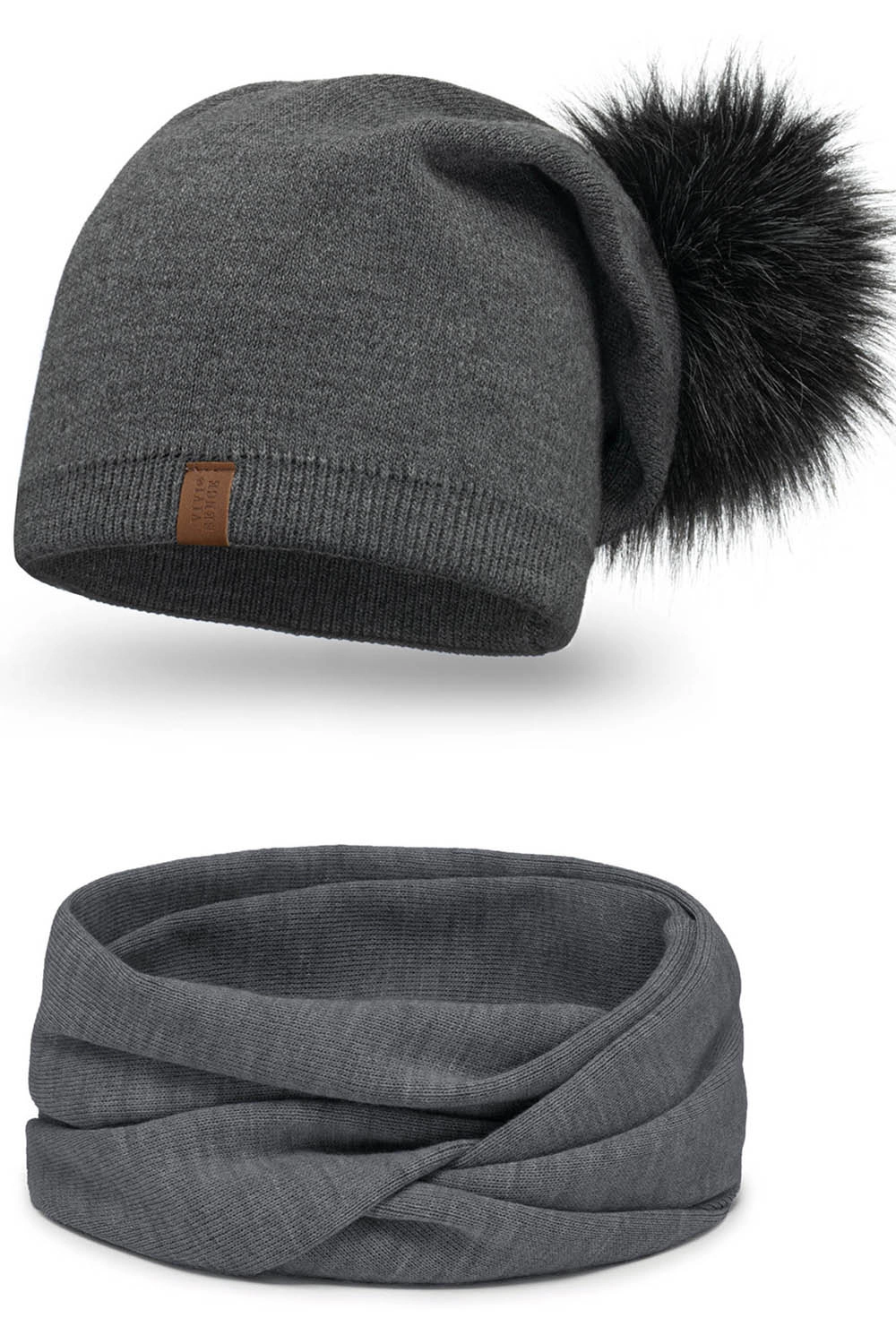 Trendiges Set für Damen: Mütze mit Bommel und Loop-Schal.