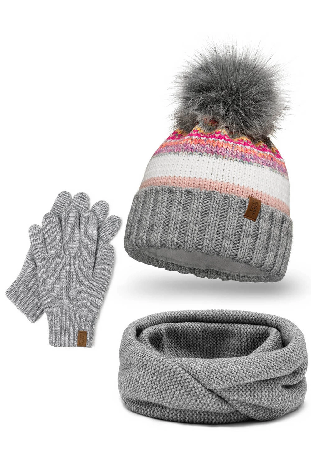 Vivisence Damen Winter-Set Warme Mütze Mit Nachhaltigem Bommel, Loop-Schal Zum Doppelt Wickeln Und 5-Finger-Handschuhe Mit Strickbündchen Für Frauen Perfekt Für Kalte Tage Und Outdoor-Aktivitäten, grau