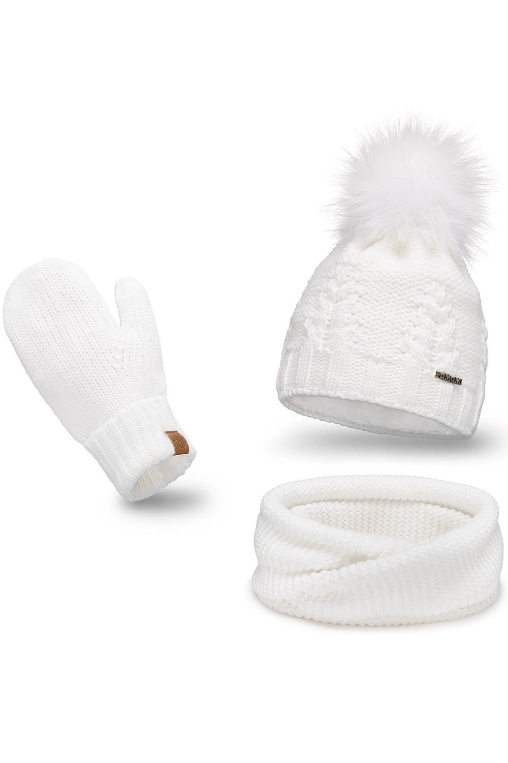 - Klassisches Set besteht aus Bommelmütze, Loopschal und Handschuhe mit einem Finger.