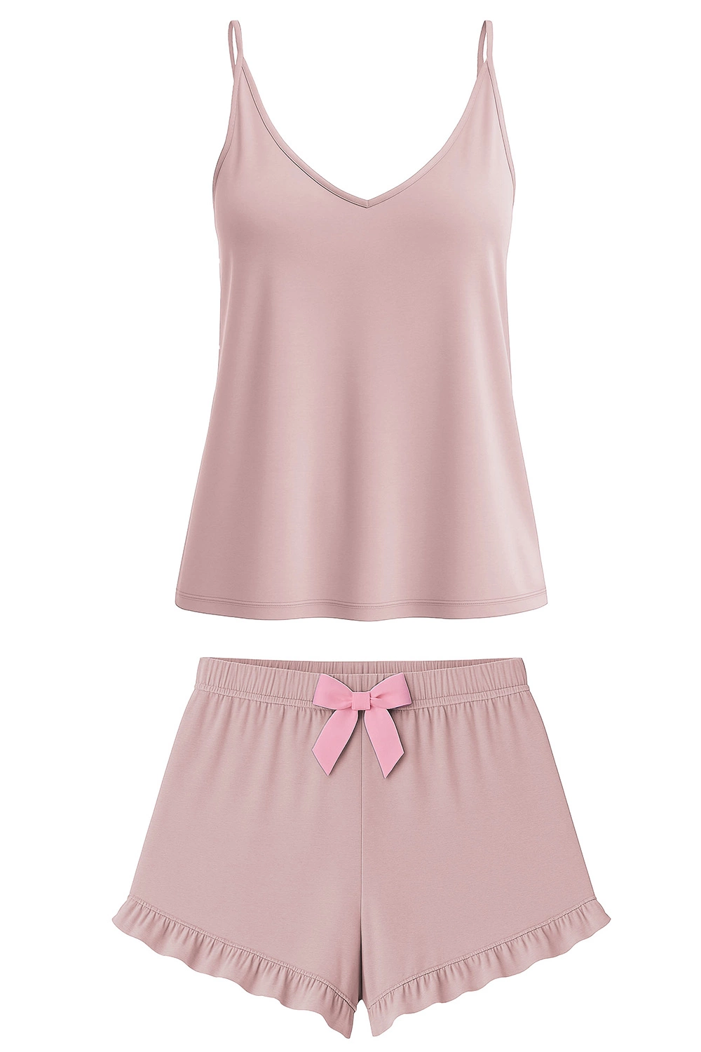 • [Dekorative Schleife]: Die rosa Schleife mit Zierschleifchen an der Taille sorgt für einen verspielten Touch und unterstreicht den femininen Stil des Pyjamas.