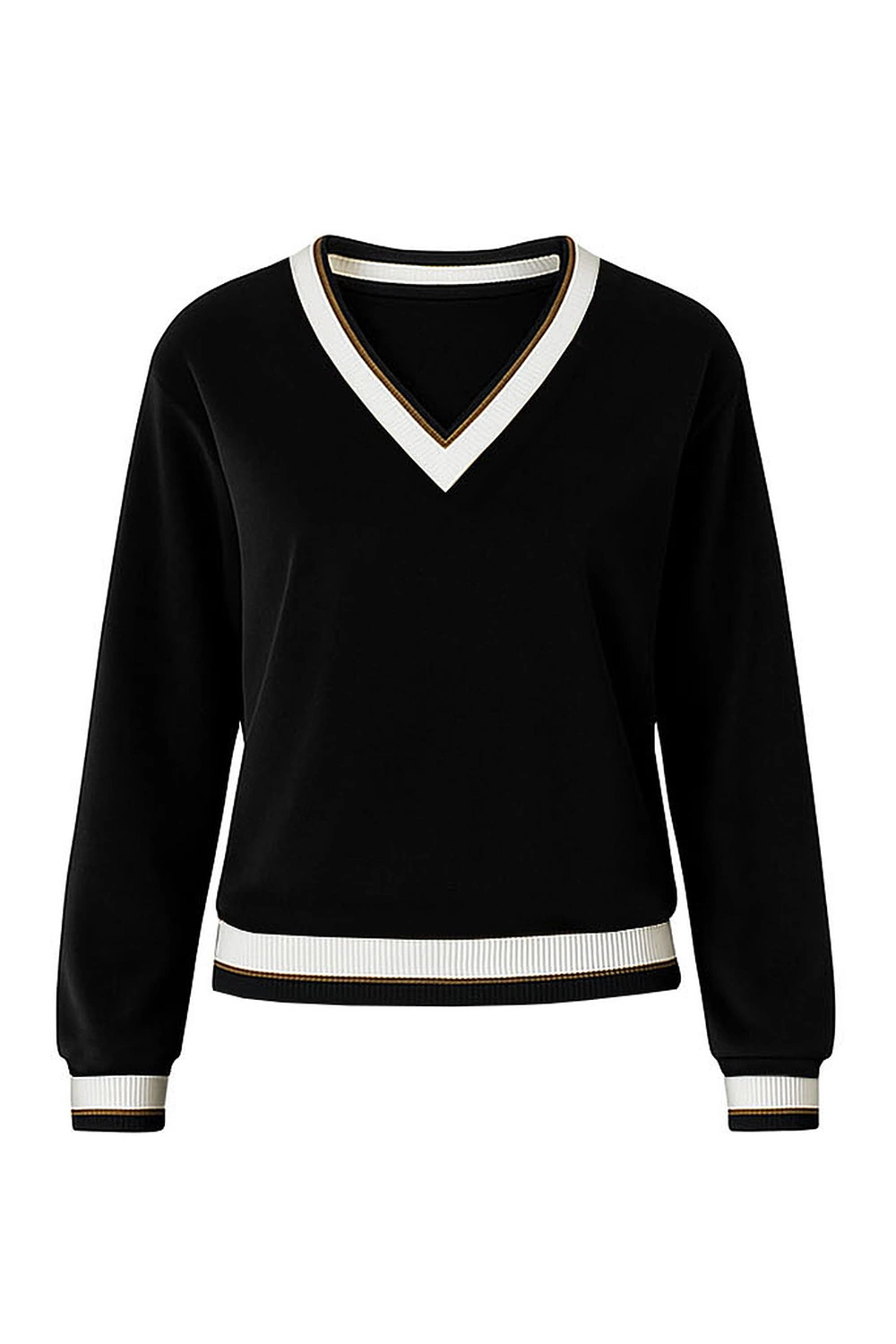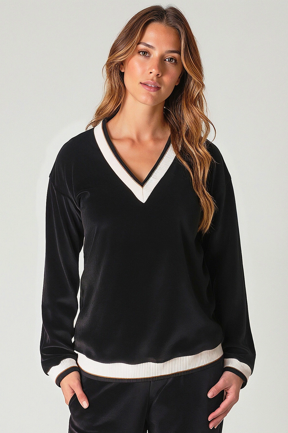 • Ausschnitt, Ärmel und Unterteil der Bluse sind mit einem Strickbündchen versehen