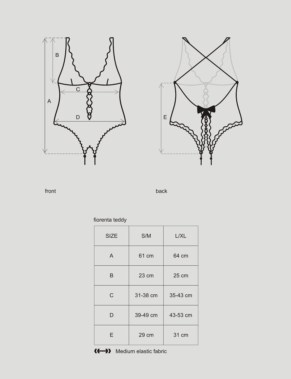 Der zauberhafte Body Fiorenta von Obsessive! Zarter Blumenmotiv, offener Schritt und verführerische Verzierung auf den Rücken - einfach 100% Pikanterie! Tolle Mischung, die einfach verrücktes Spielchen sichert! Vertrauen Sie uns, Ihr Mann meint auch so. Warten Sie nicht mehr lange! Der tiefe Ausschnitt auf der Vorderseite zeigt sich mit sexy Spitze. Die regulierbaren und auf den Rücken gekreutztenTräger sorgen für perfekte Anpassung. Hinten eine verführerische Satinschleife. Scharfer und offener Schritt mit regulierbaren Streifen. Die Ränder sind mit Spitze verziert. Perfekte Verarbeitung. Der Body gefertigt aus elastischem Material.