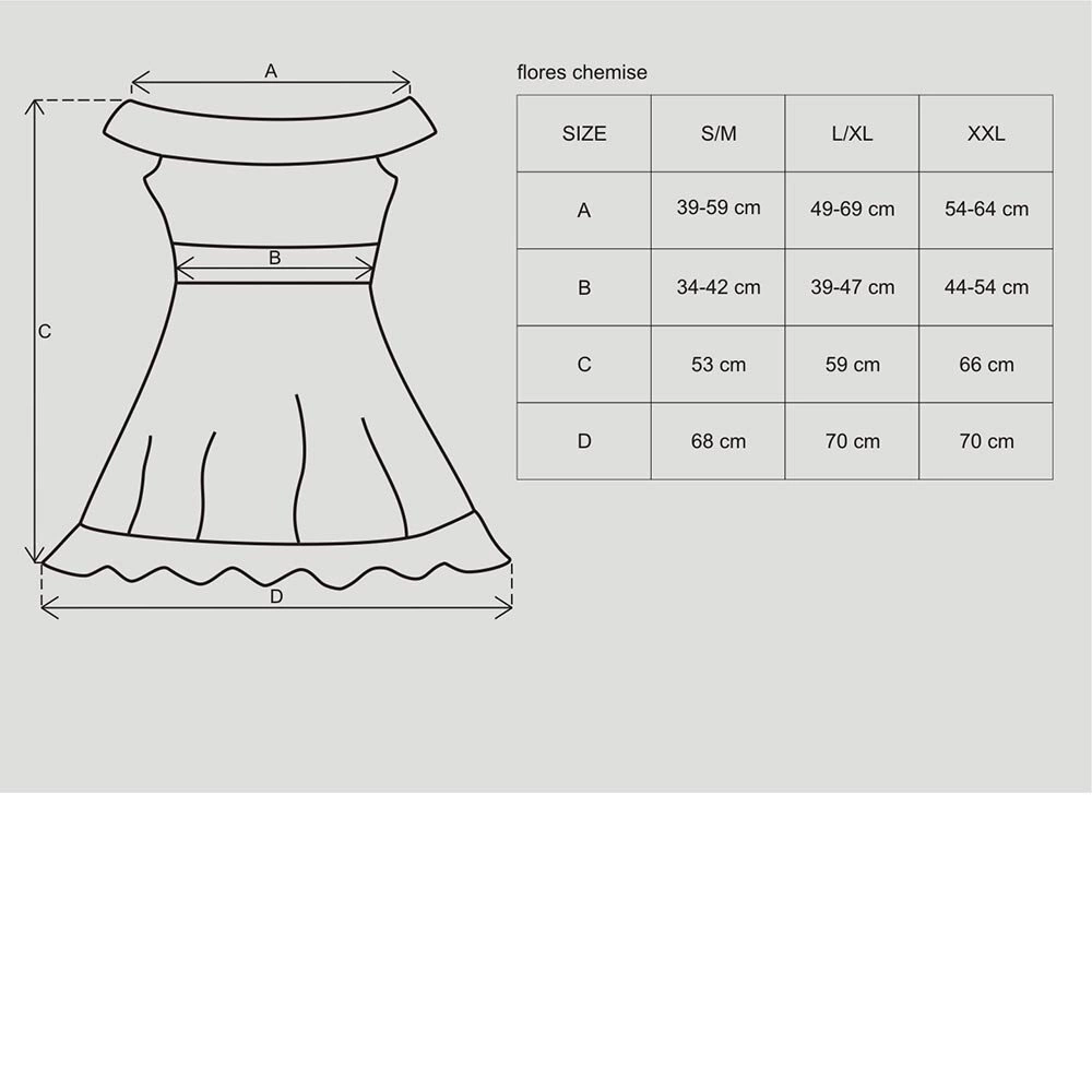 Zauberhaftes, durchsichtiges Unterkleid für romantischen Abend zu zweit. Auf der Brusthöhe enthüllt das Gewebe verlockend die weiblichen Reize. Die Spitzenträger können auf die Schultern gesunken werden. Das Unterkleid ist im unteren Teil breiter und aus der Spitze mit Blumenmotiven angefertigt, und der hintere Teil ist hoch ausgeschnitten. Passender String enthalten.