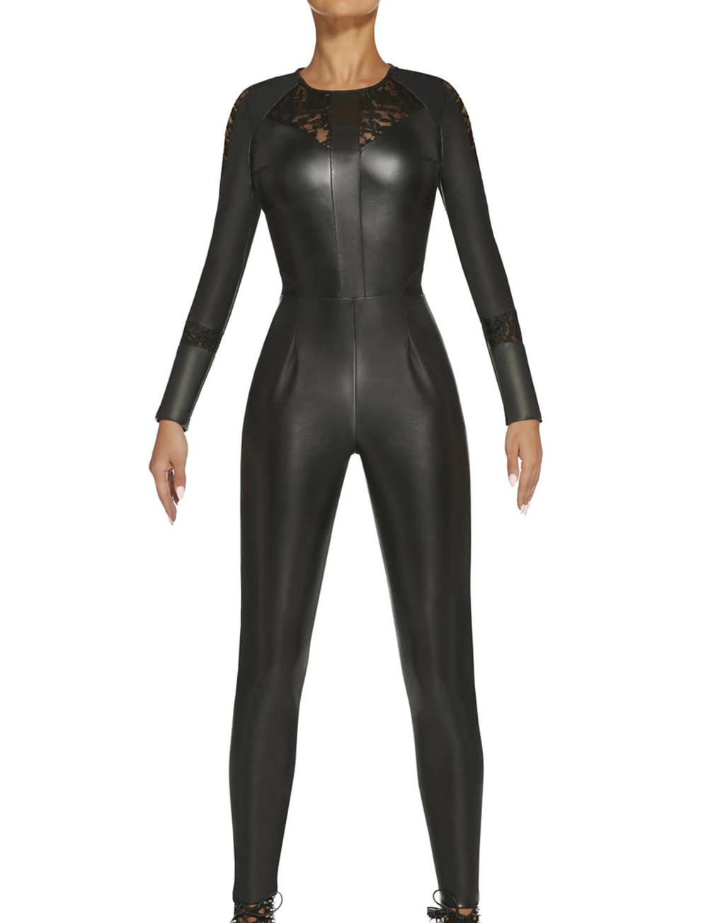 - Verführerischer Jumpsuit gefertigt aus Eco-Leder und sinnlicher Spitze