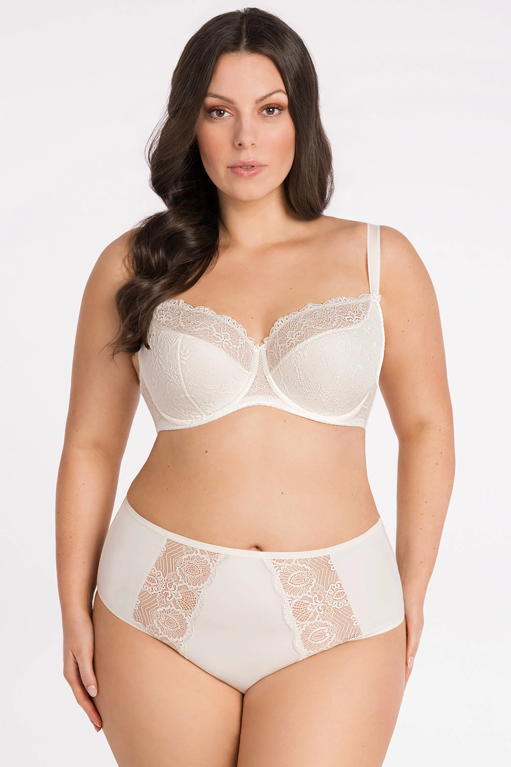 Eleganter Büstenhalter für Frauen mit größeren Größen! Volle Cups und die Brücke wurden mit zarter Spitze über florale Akzente belegt. Der untere Teil des Cups verstärkt mit weichem Schaum, der zusätzlich mit Baumwolle unterlegt wurde. Seitenstäbchen stützen den Busen. Die Träger sind regulierbar, nicht abnehmbar, verziert und verschieden breit. Zwischen den Cups befindet sich wunderschönes Schleifchen, das dem BH noch mehr Charme verleiht. Das Modell gibt den Brüsten guten Halt und formt ein schönes Dekolletee. Zum Unterwäsche-Set empfehlen wir Ihnen den Slip K358 Blanca, der auf separater Produktseite zu kaufen ist.