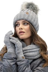Vivisence Modisches Damen-Set Mütze Mit Kunstpelz-Bommel Weich Gefüttertem Loop-Schal Und 5-Finger-Handschuhen Aus Warmem Garn Gefertigt Antistatisch Und Perfekt Für Kalte Wintertage, hellgrau